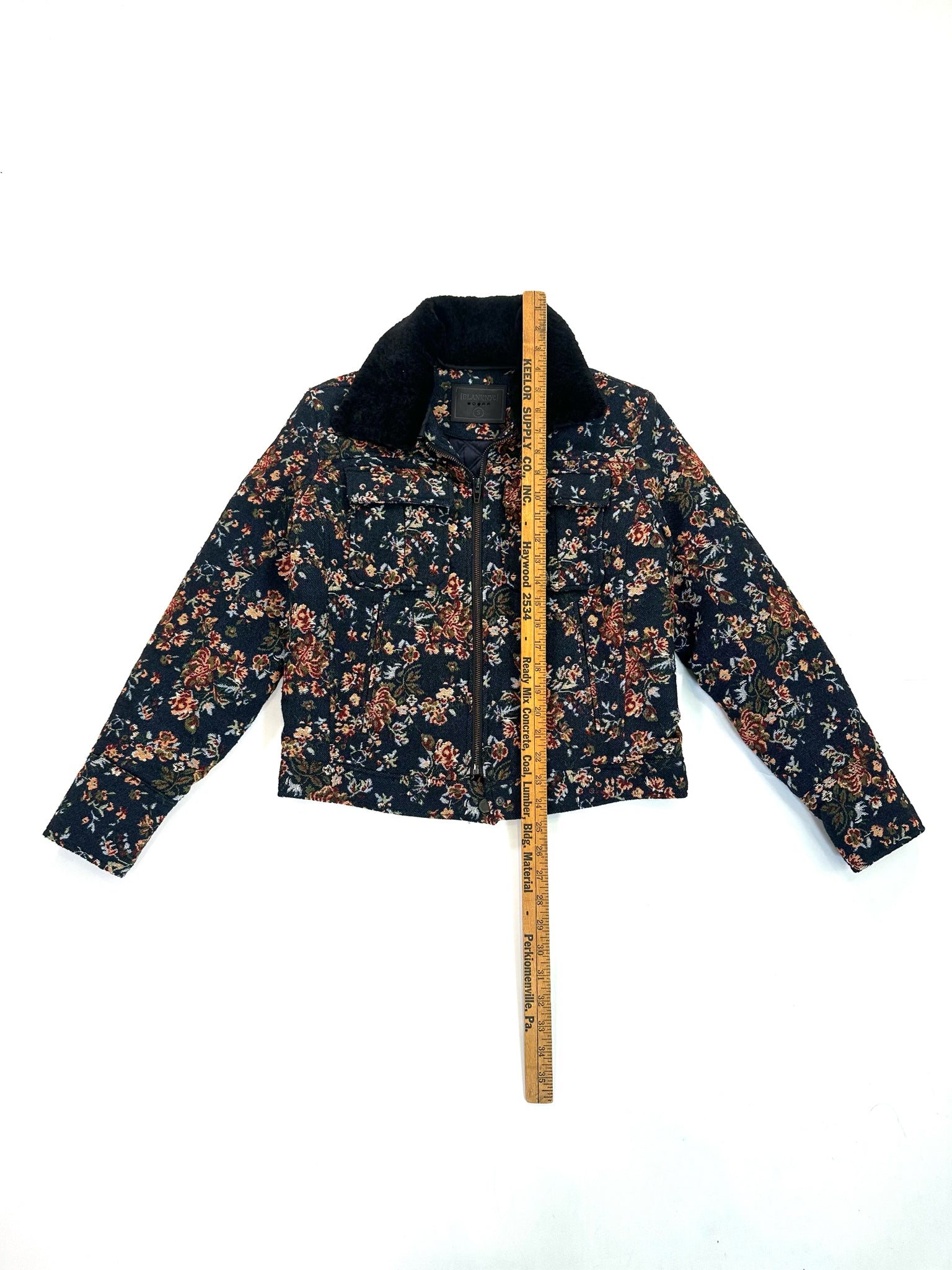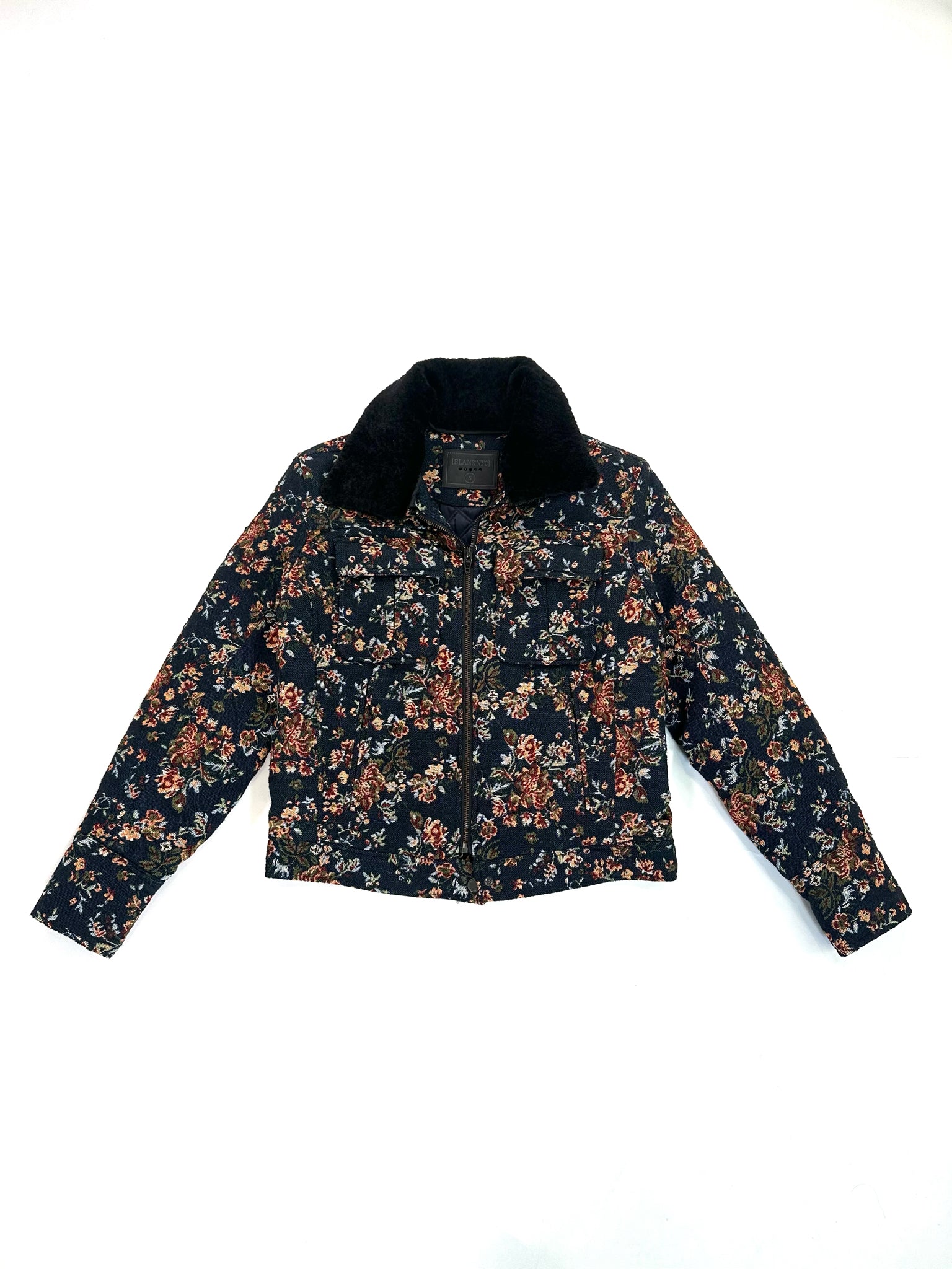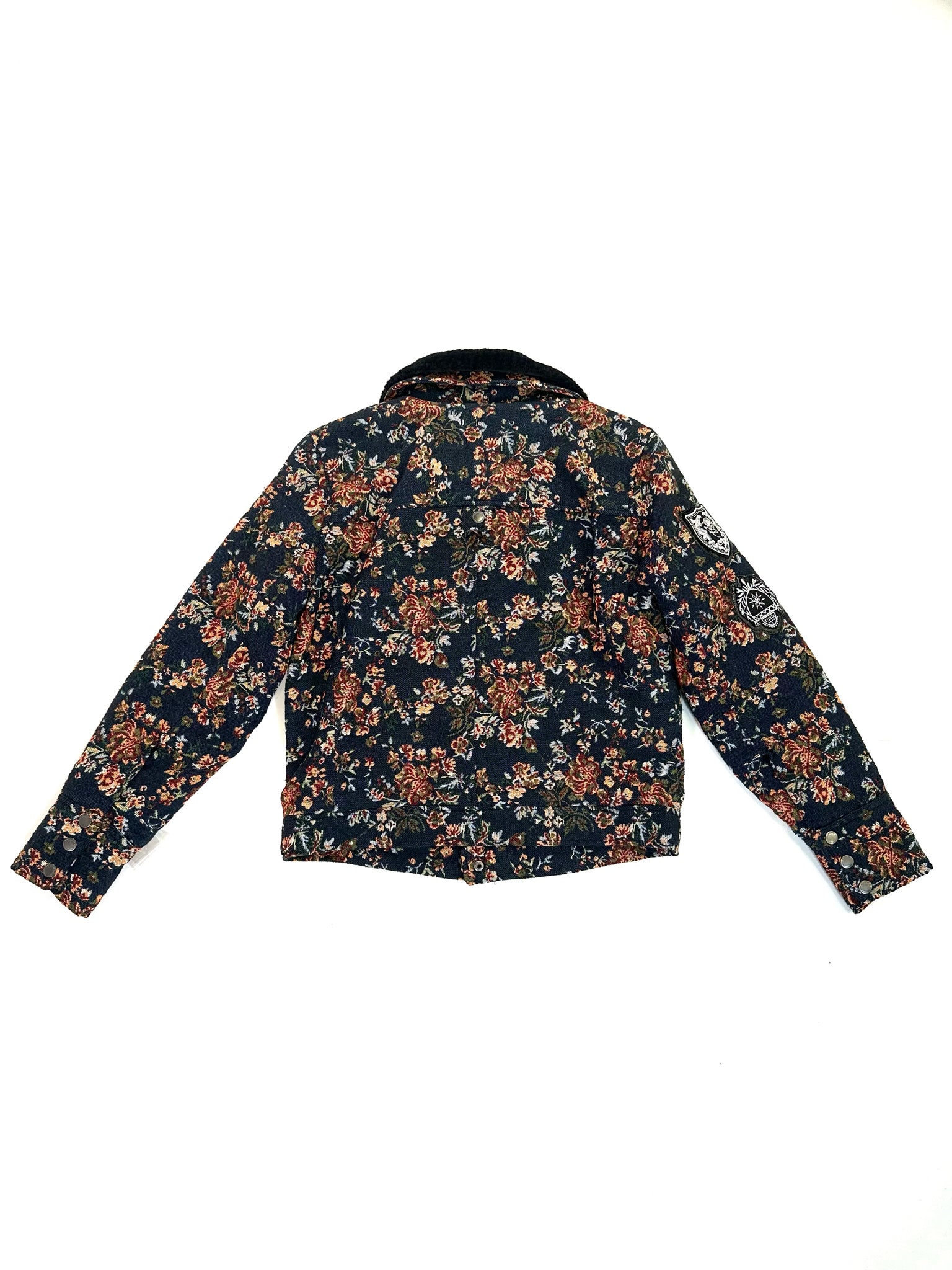 BLANK Size S MULTI COLORS JACKET TAPESTRY FLORAL FAUX FUR COLLAR NAVY PINK GREEN