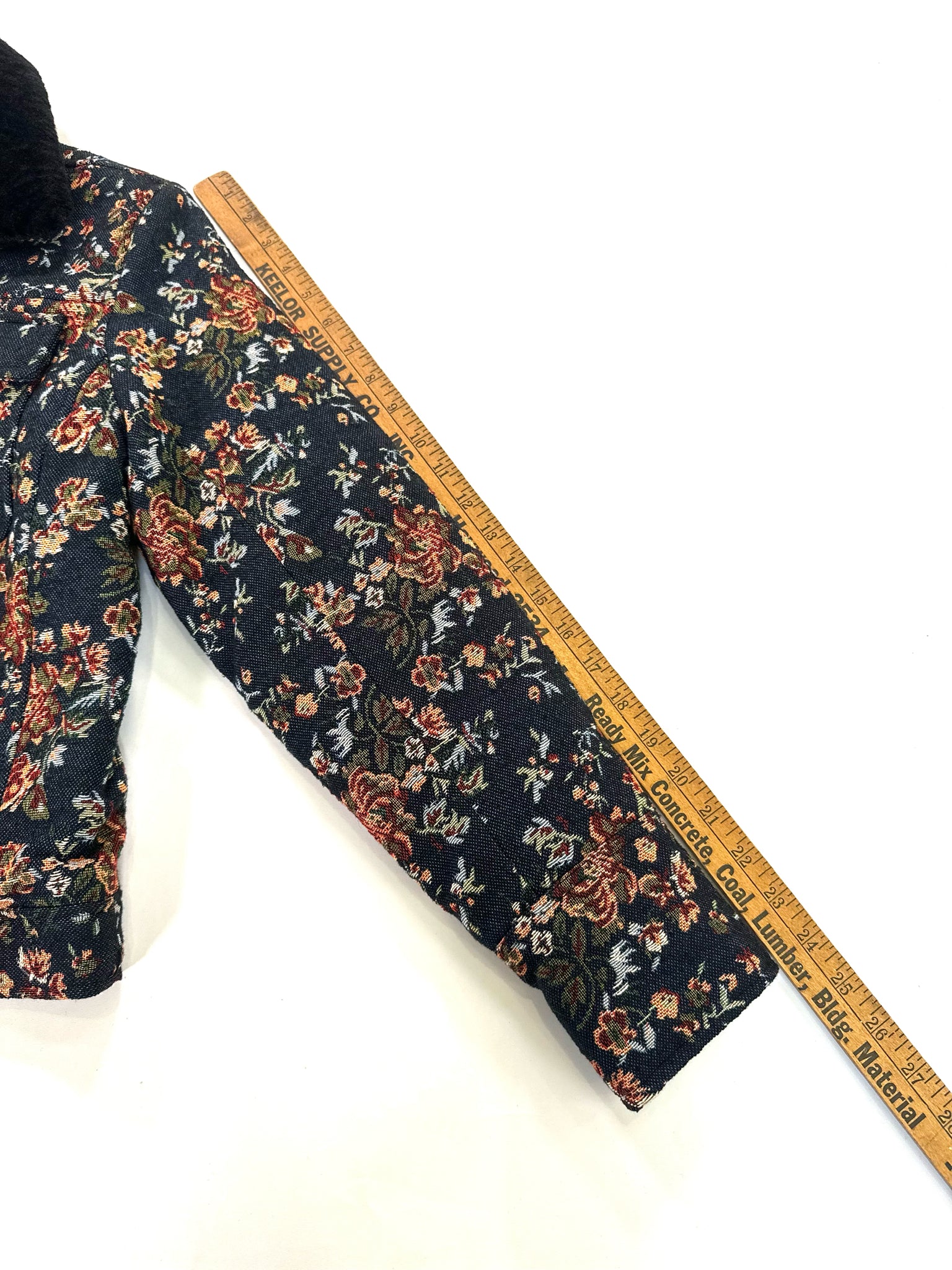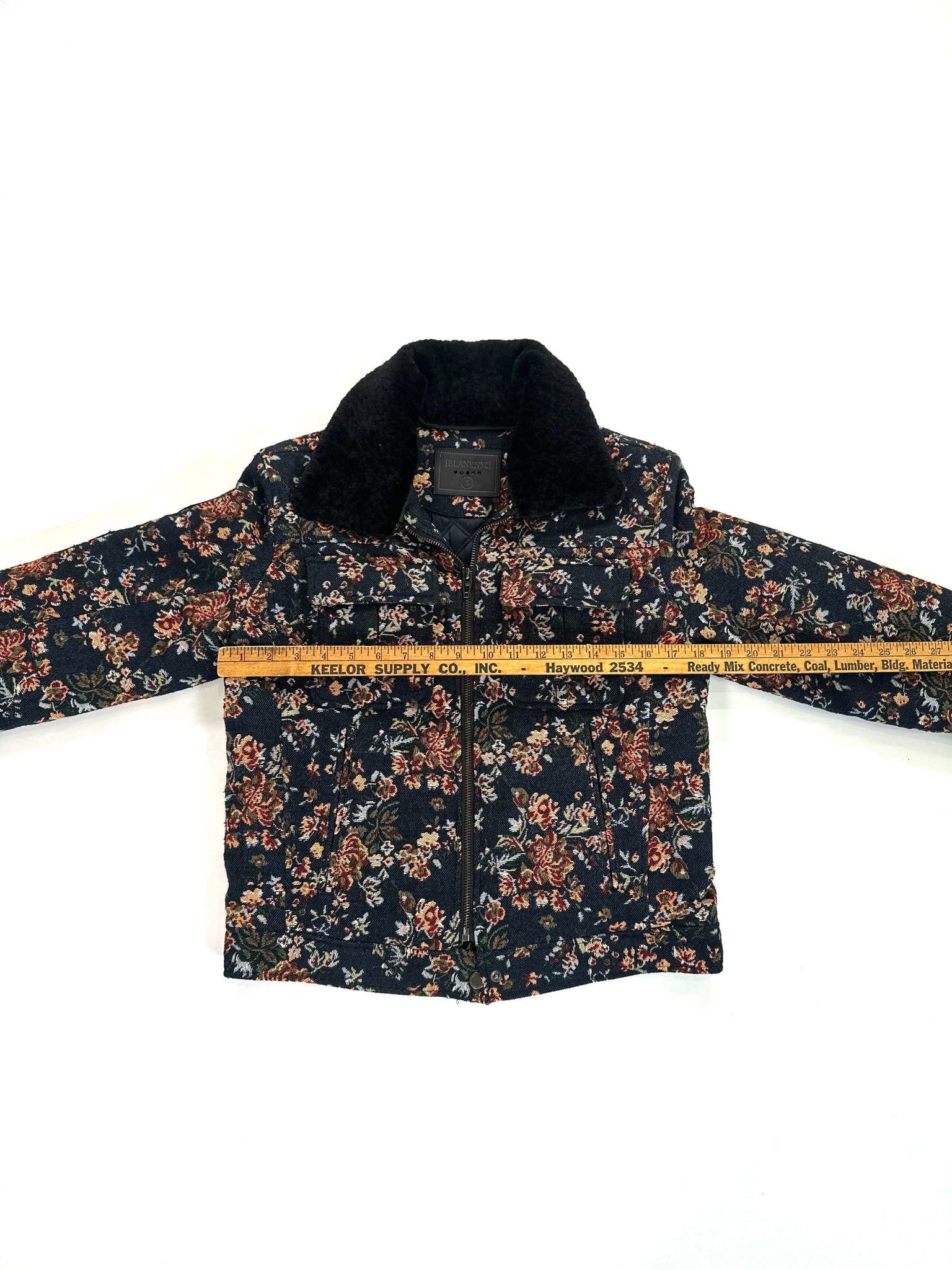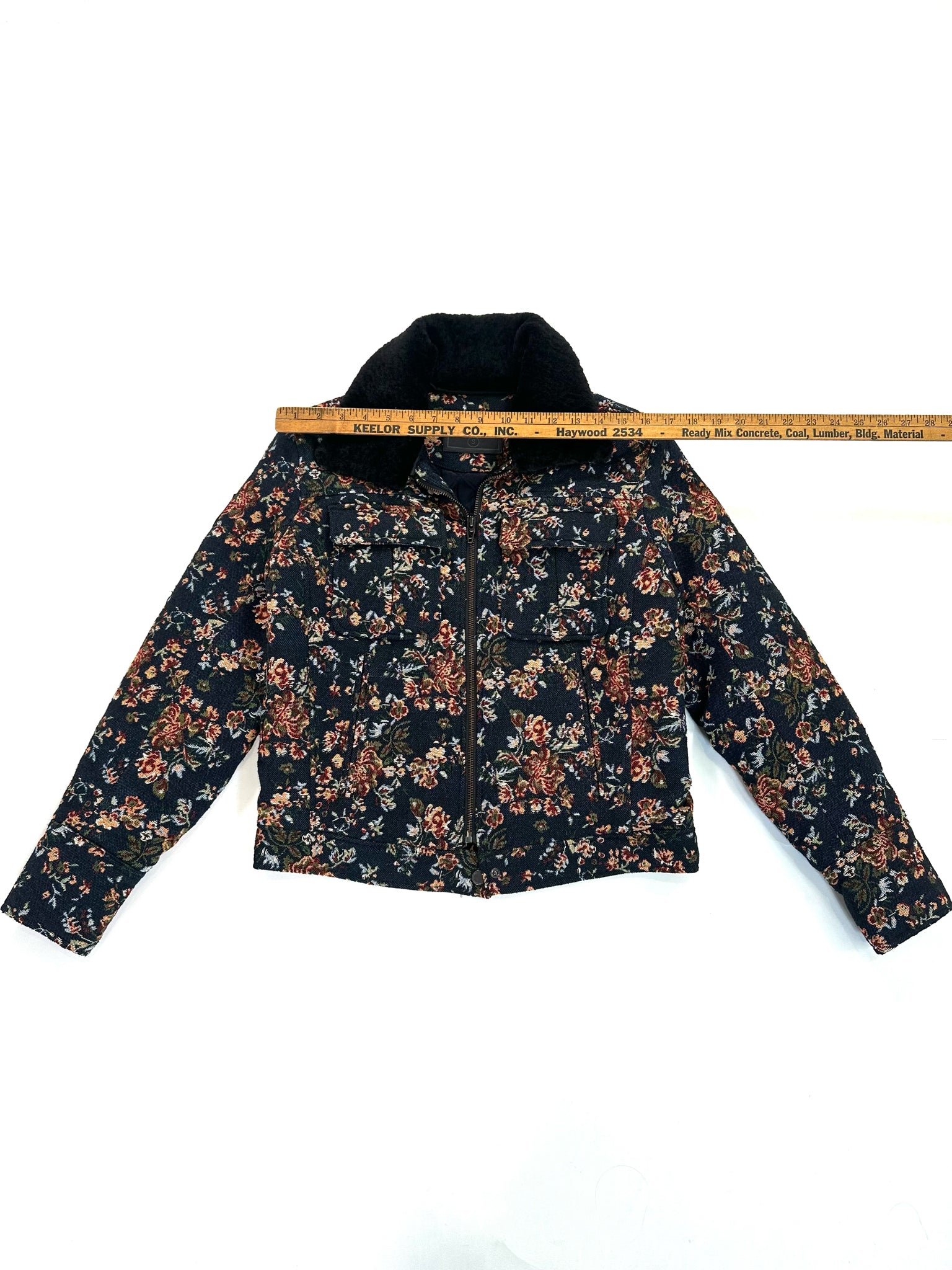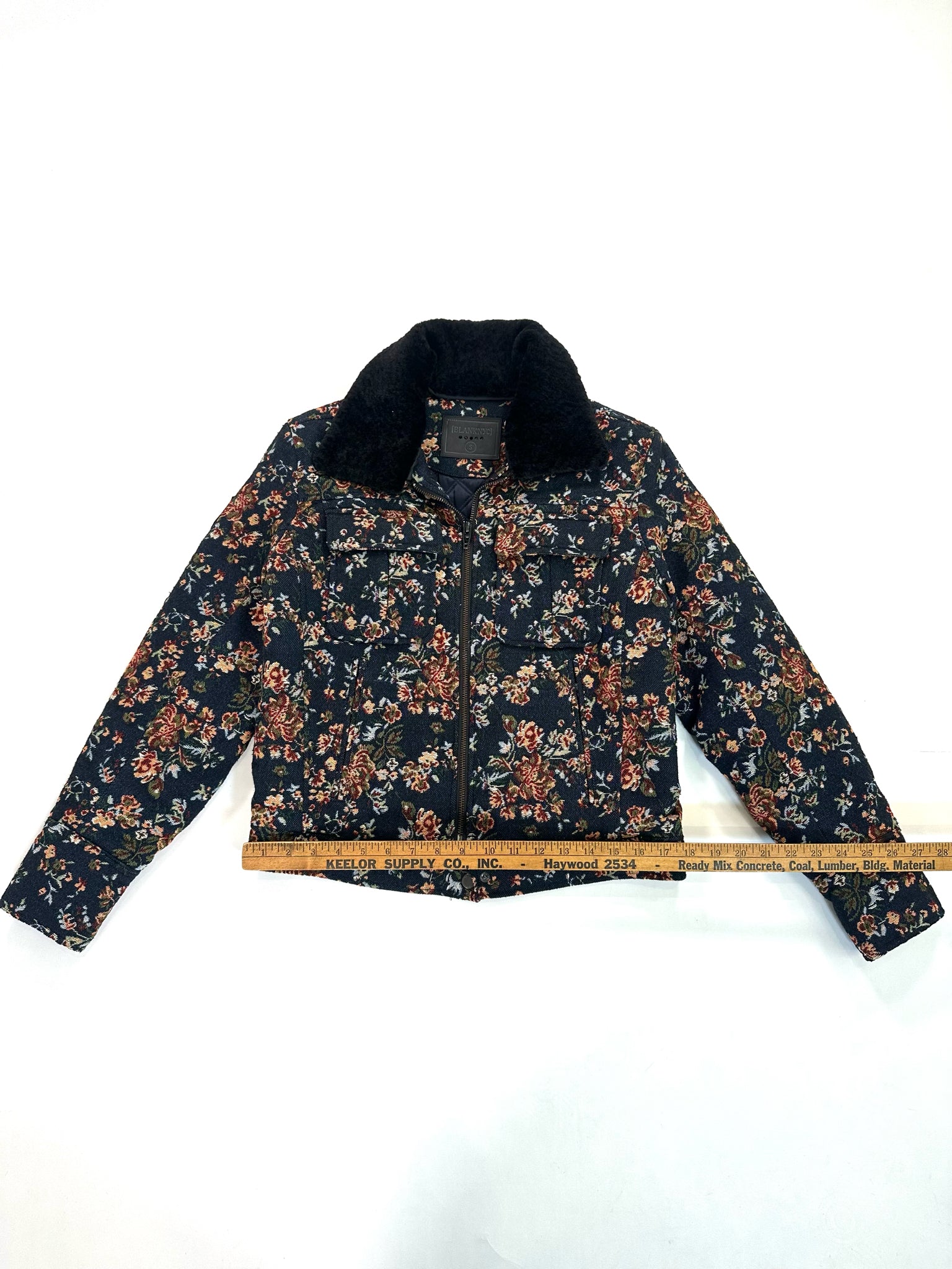 BLANK Size S MULTI COLORS JACKET TAPESTRY FLORAL FAUX FUR COLLAR NAVY PINK GREEN