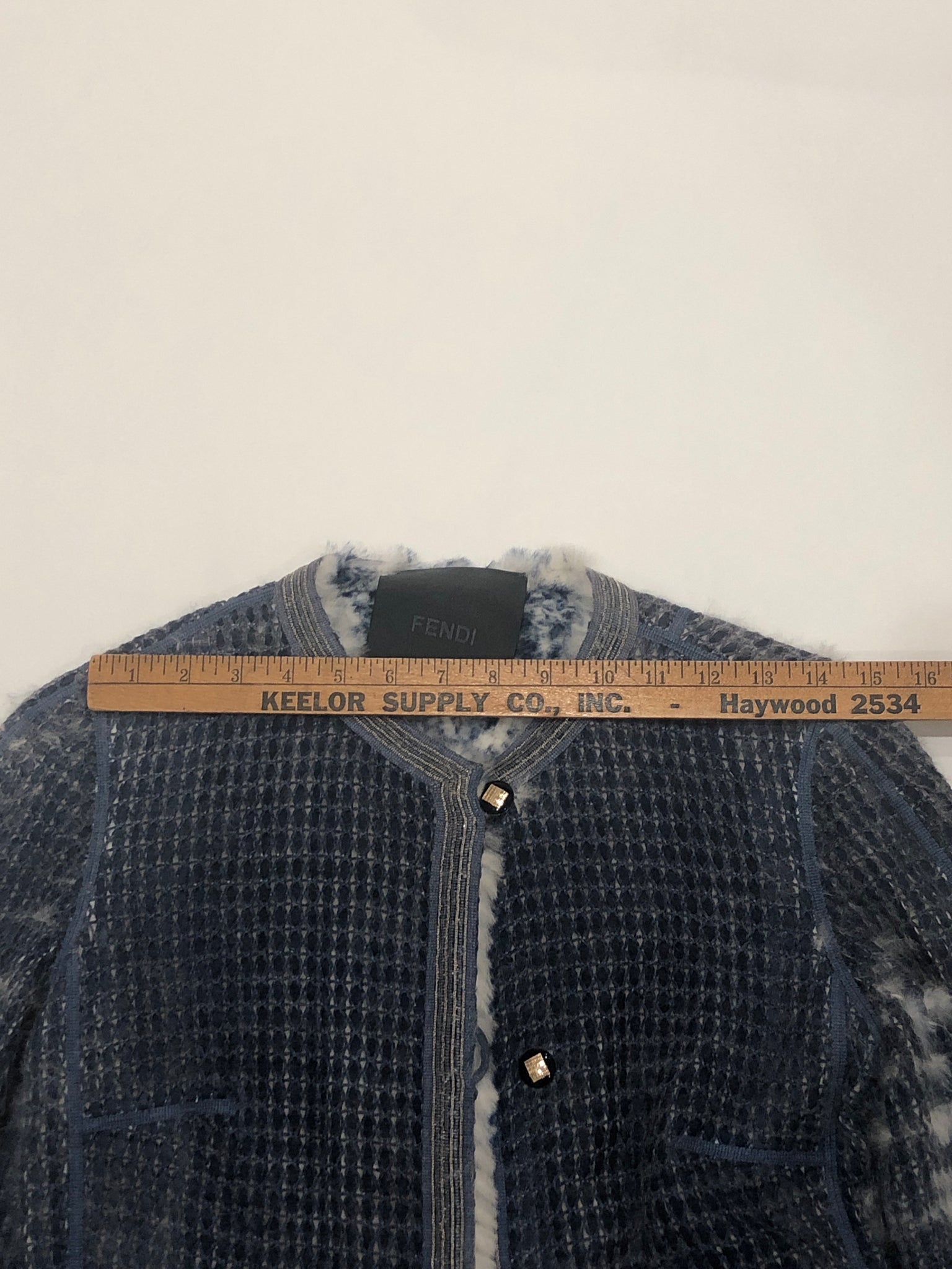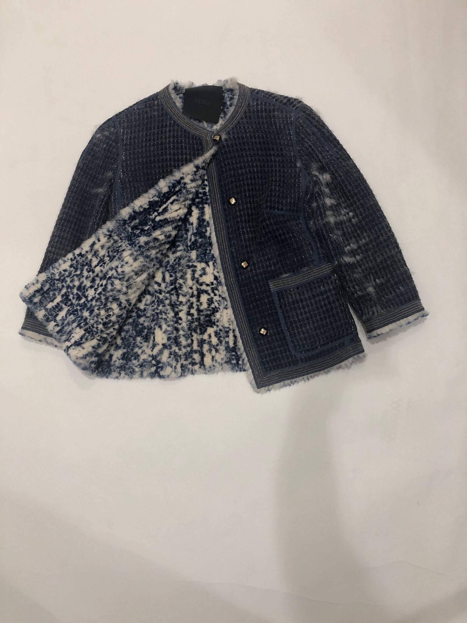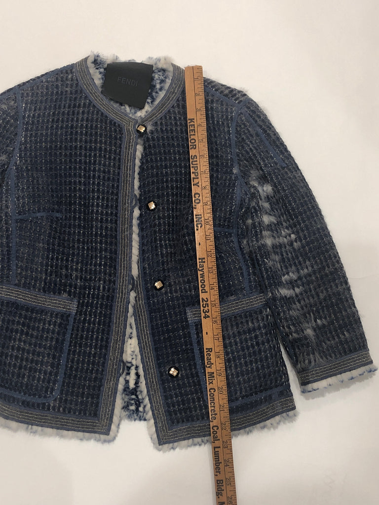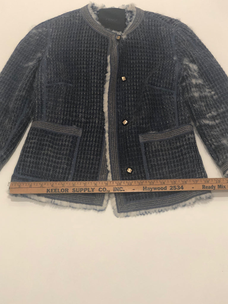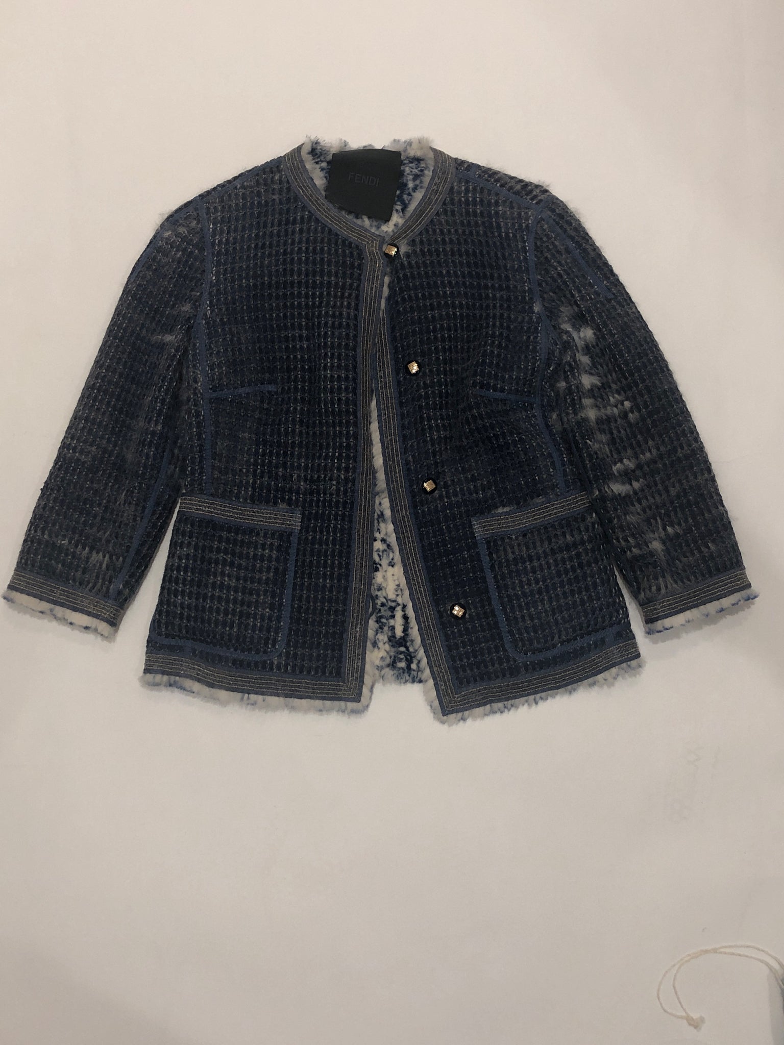 FENDI Size S BLUE BLAZER COTTON 3/4 SLEEVES FUR LINED BLACK GOLD TONE BUTTONS