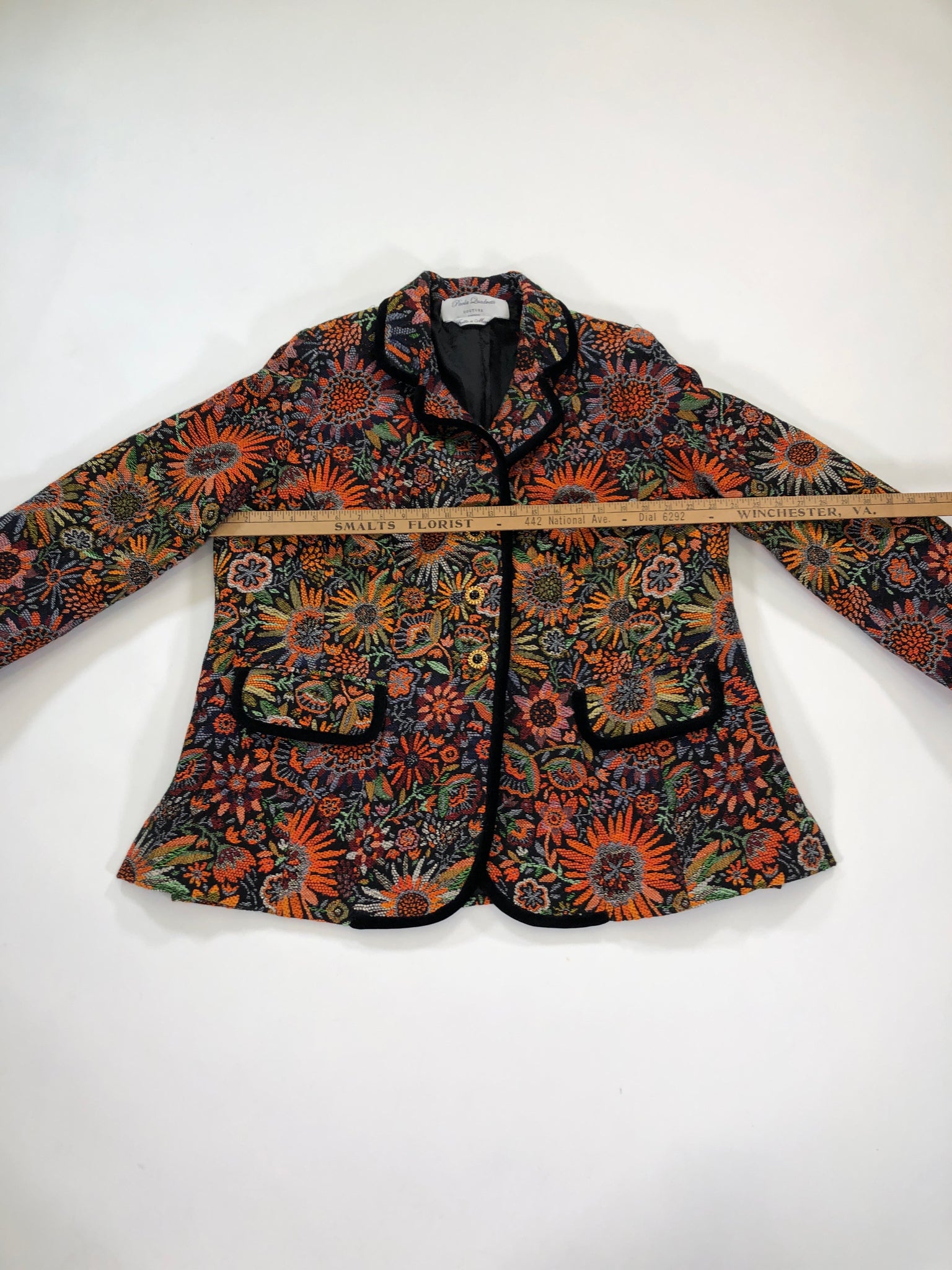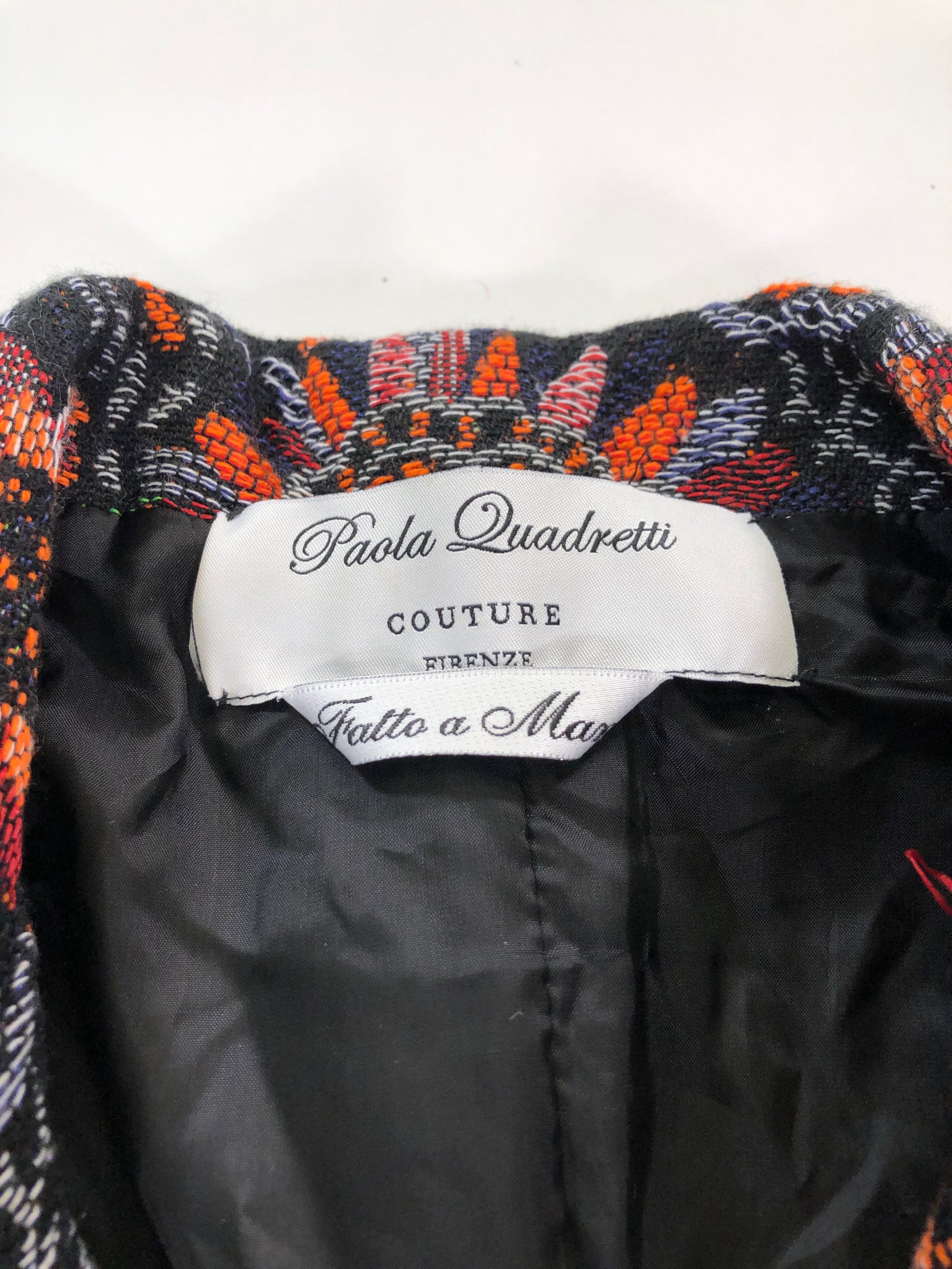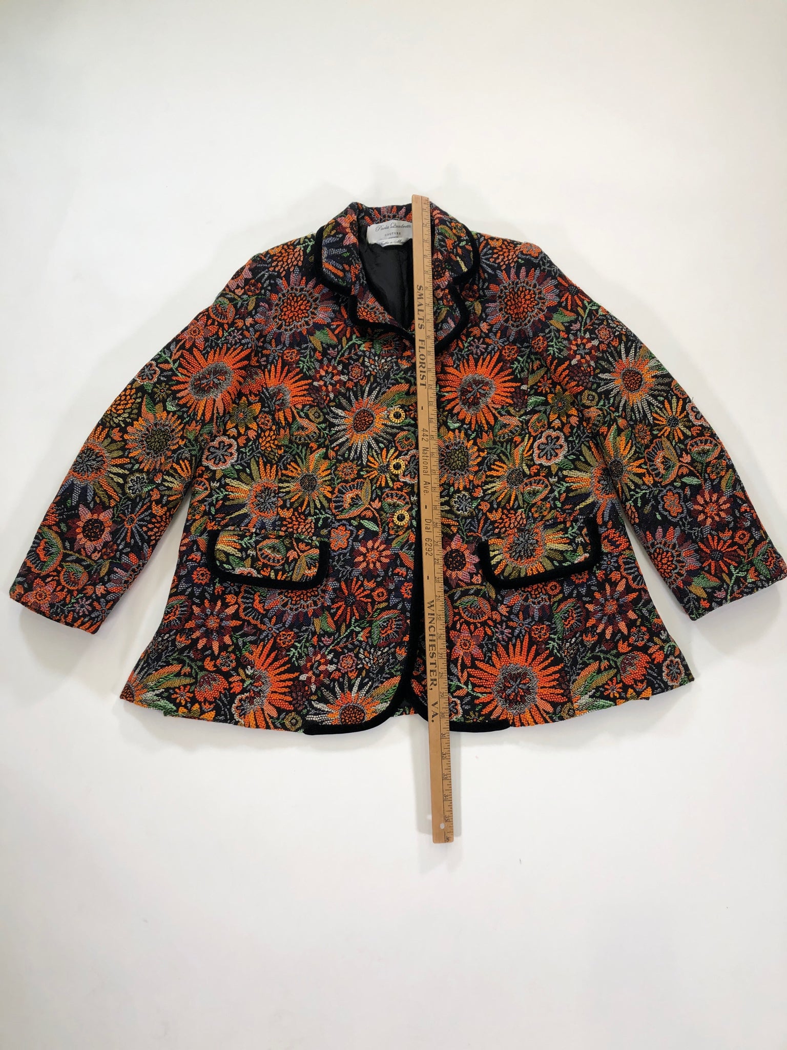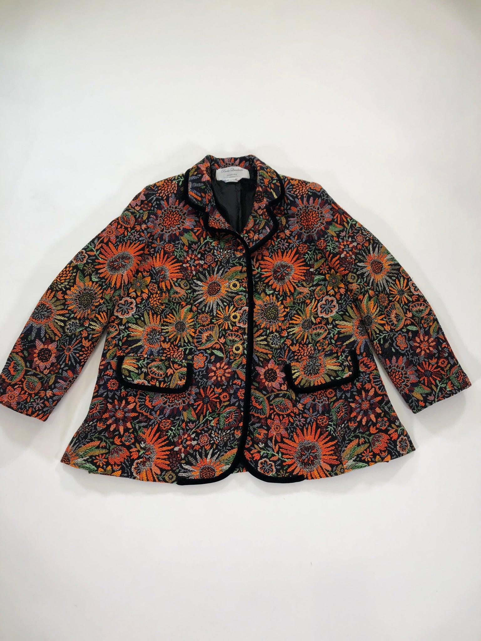 ORANGE GREEN BLACK METALLIC THREAD FLORAL TAPESTRY PAOLA QUADRETTI COUTURE GOLD TONE BUTTONS SILK LINEN BLEND
