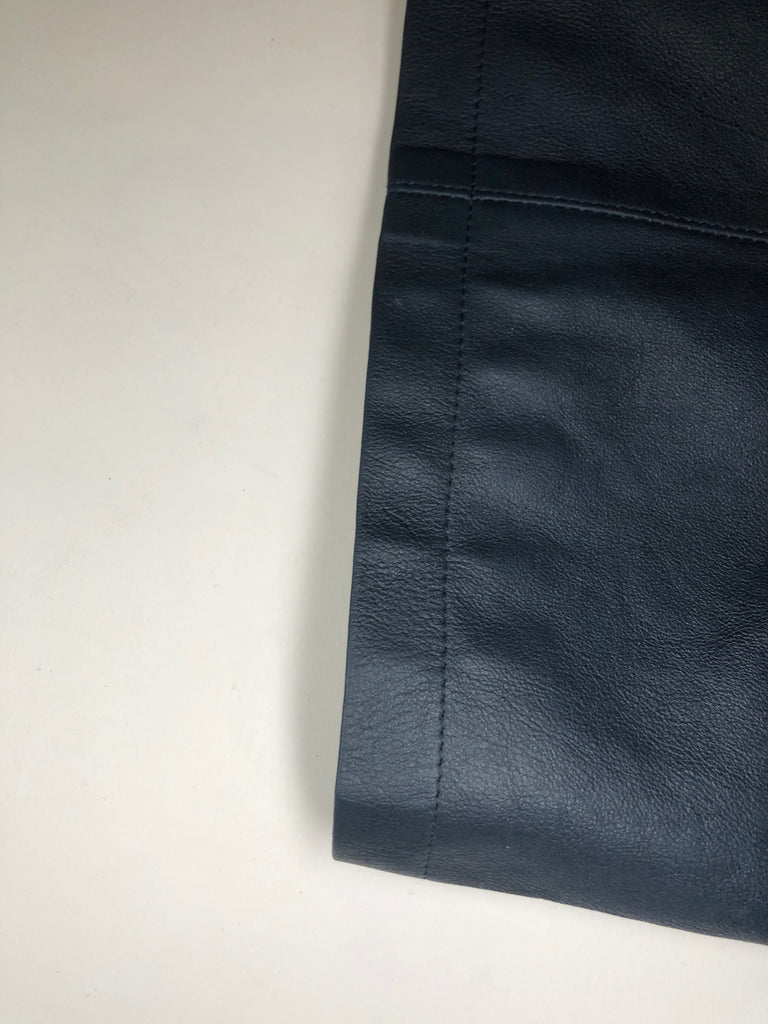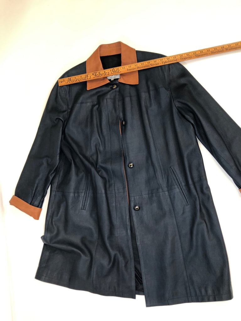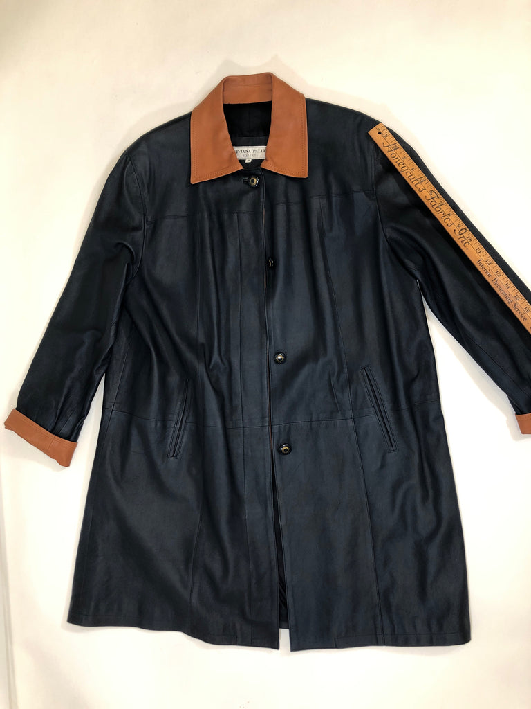 ITALY Size M NAVY LEATHER COGNAC COLLAR CUFFS LIVIANA PALLI LONG SLEEVES