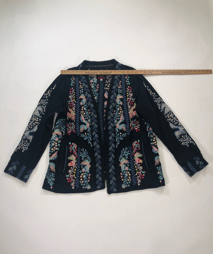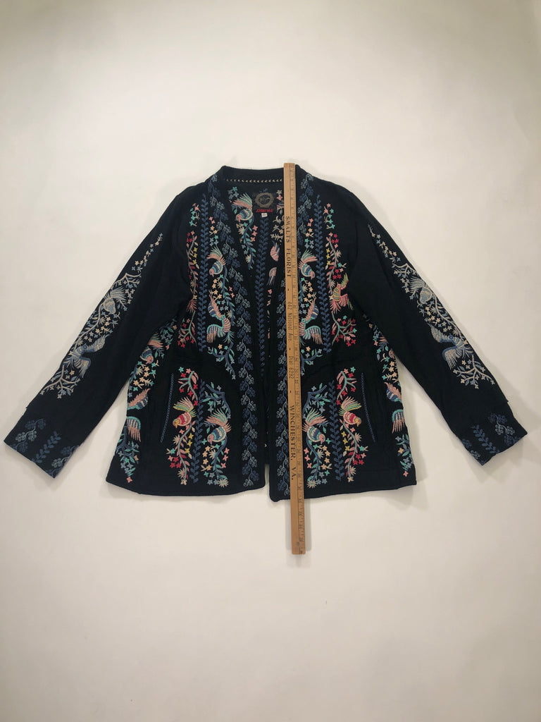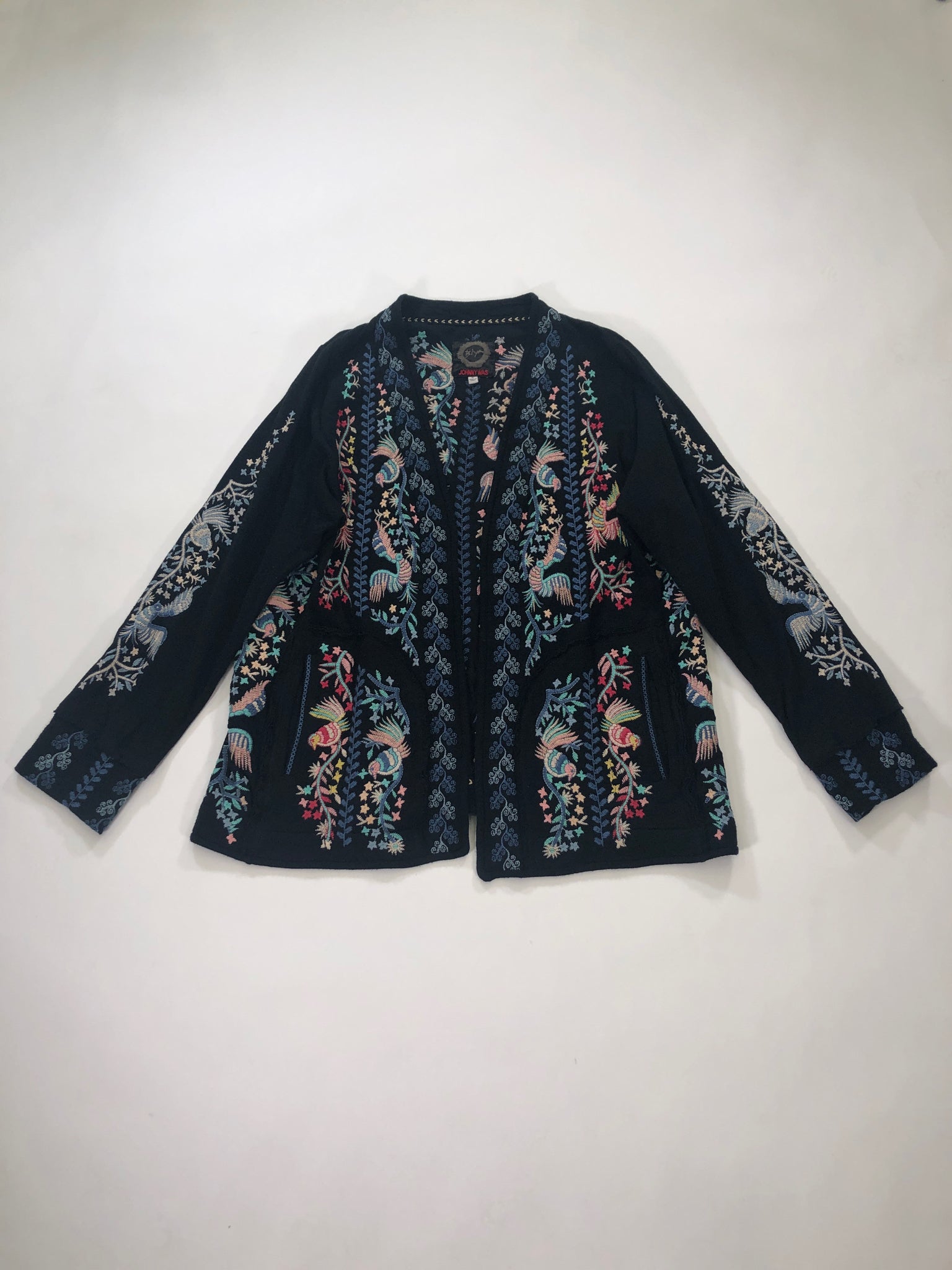 JOHNNY WAS Size XL JACKET BLACK PINK BLUE AQUA BIRDS EMBROIDERY LS