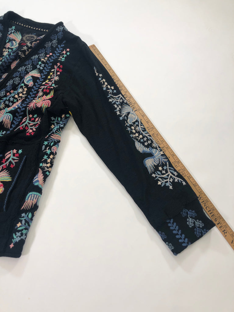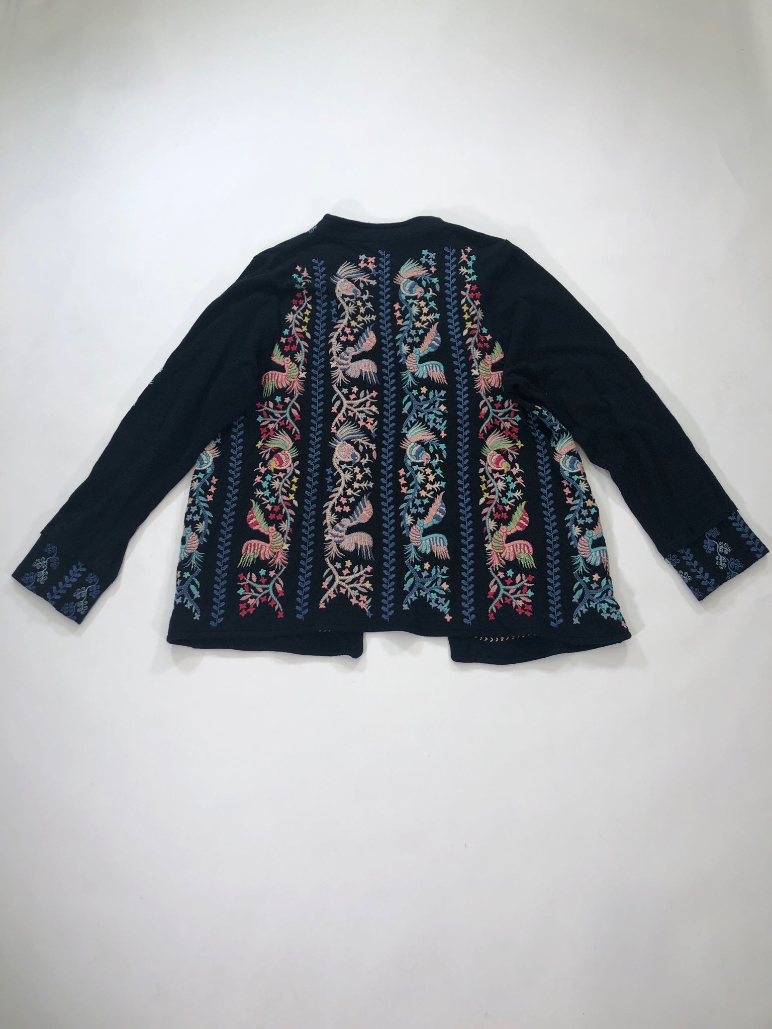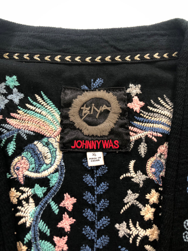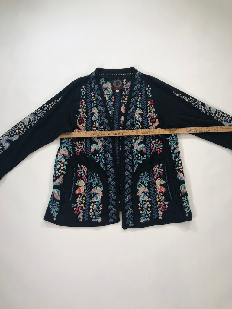 JOHNNY WAS Size XL JACKET BLACK PINK BLUE AQUA BIRDS EMBROIDERY LS