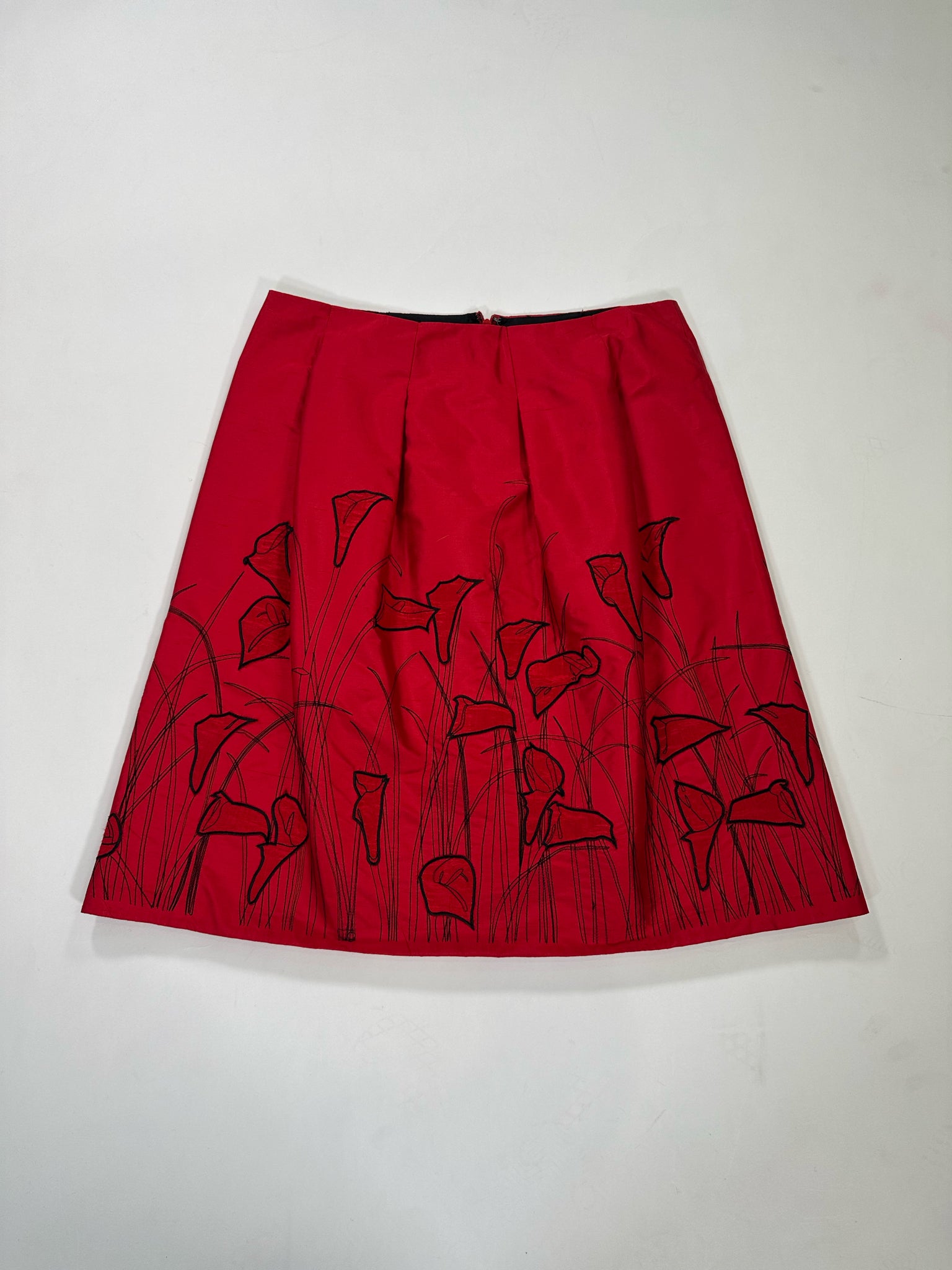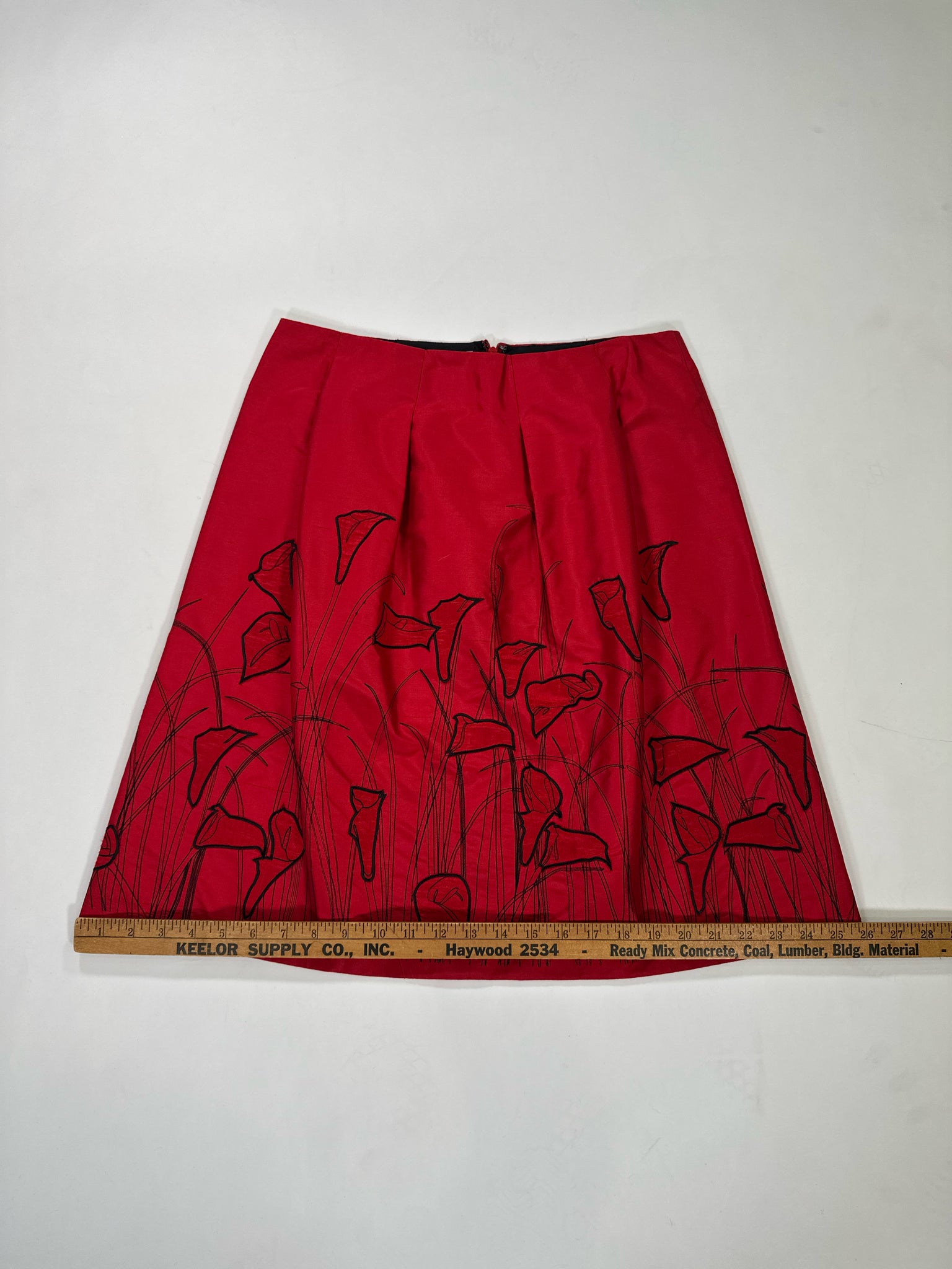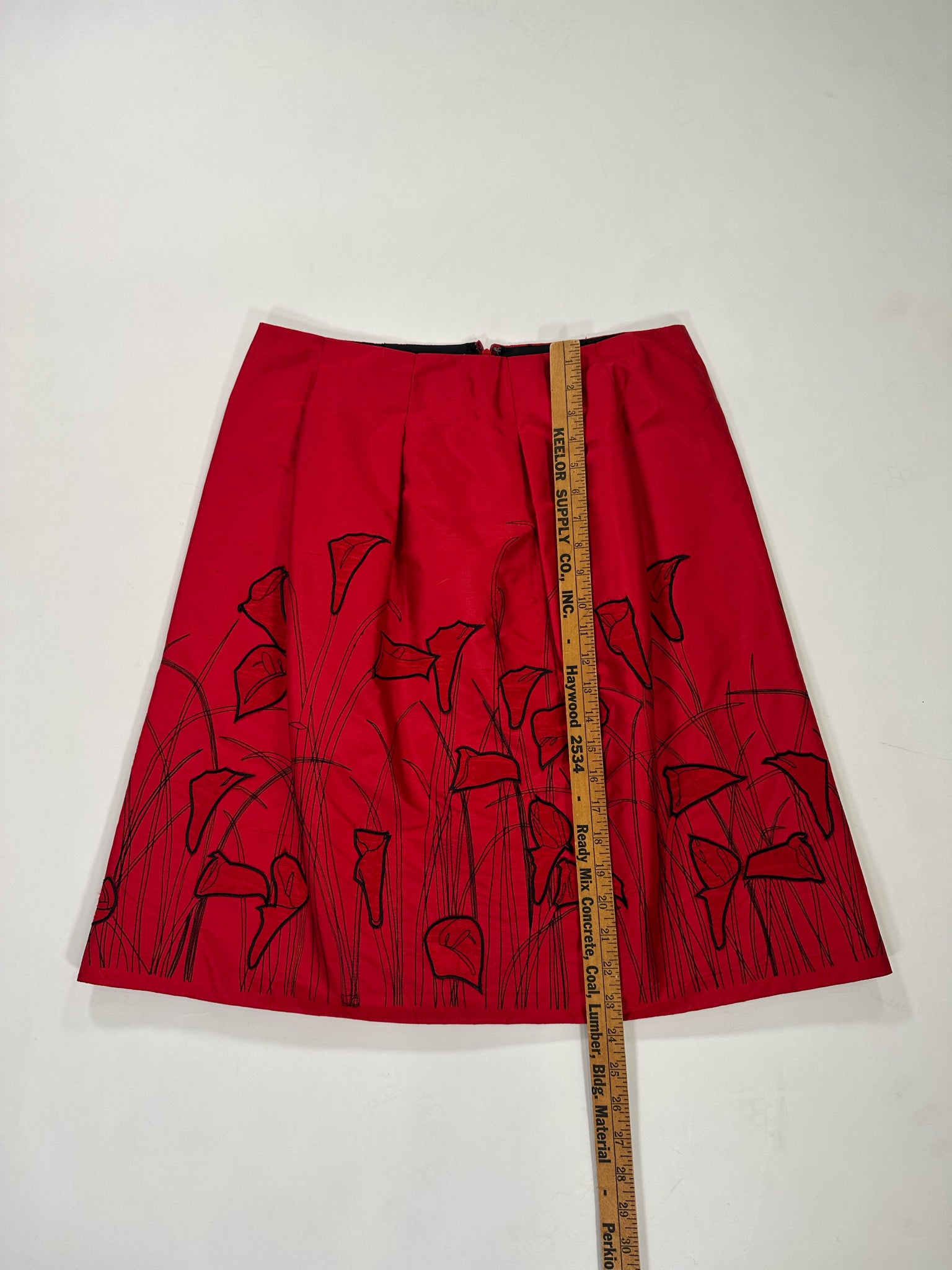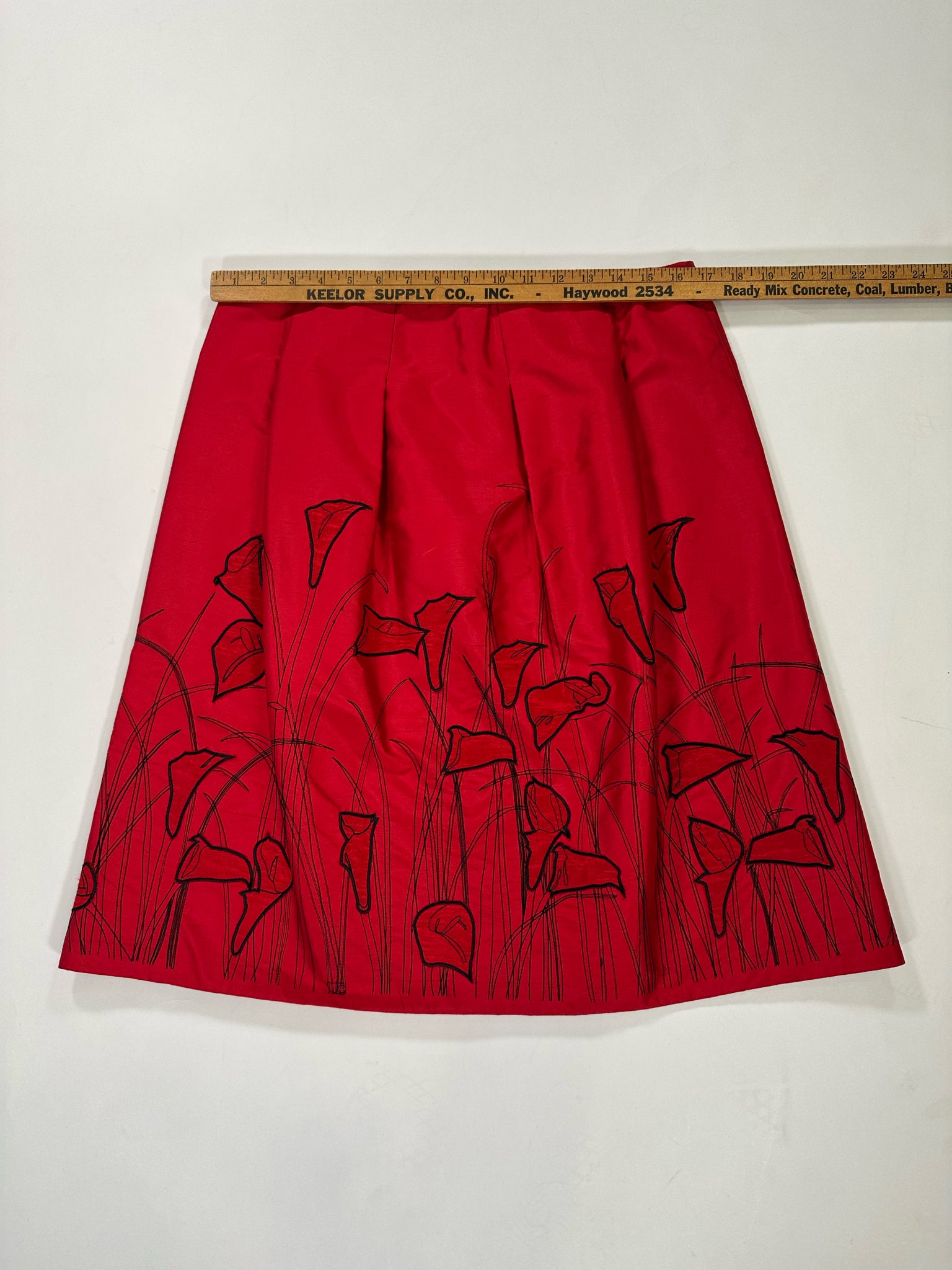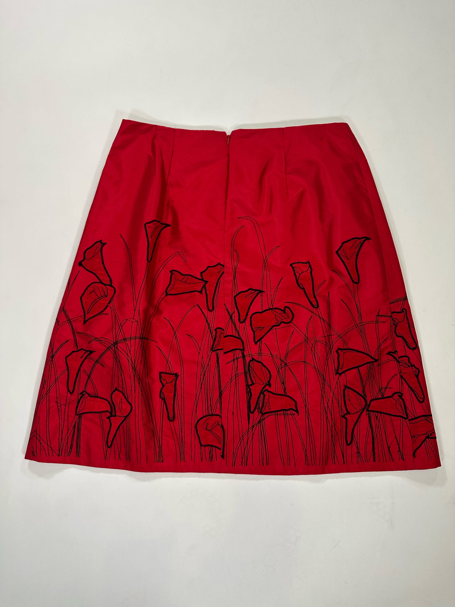 KAY UNGER Size 10/12 RED SKIRT SILK BLACK CALLA LILIES - RED / 10/12 is backordered and will ship as soon as it is back in stock.