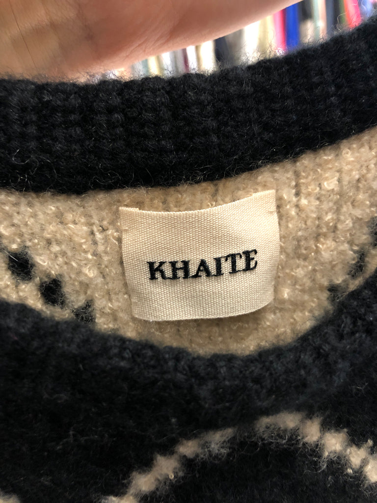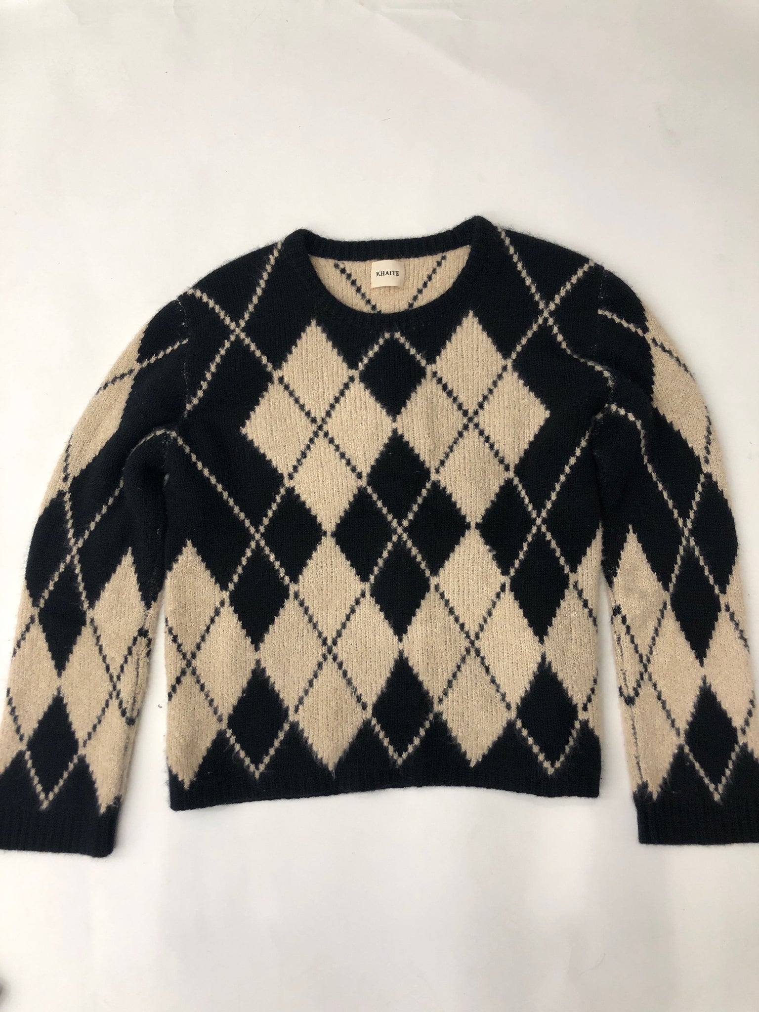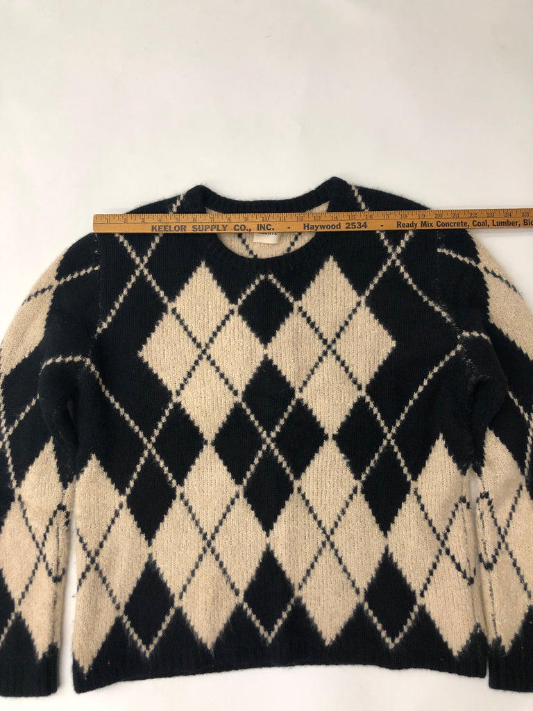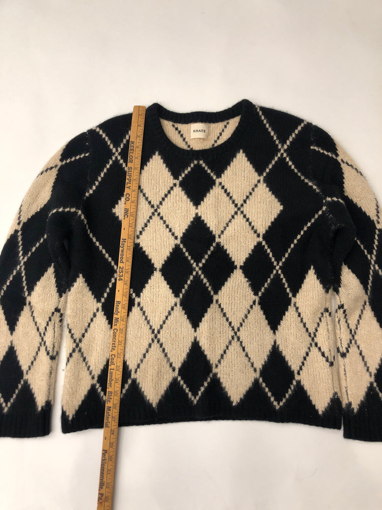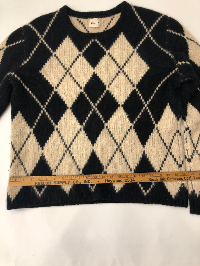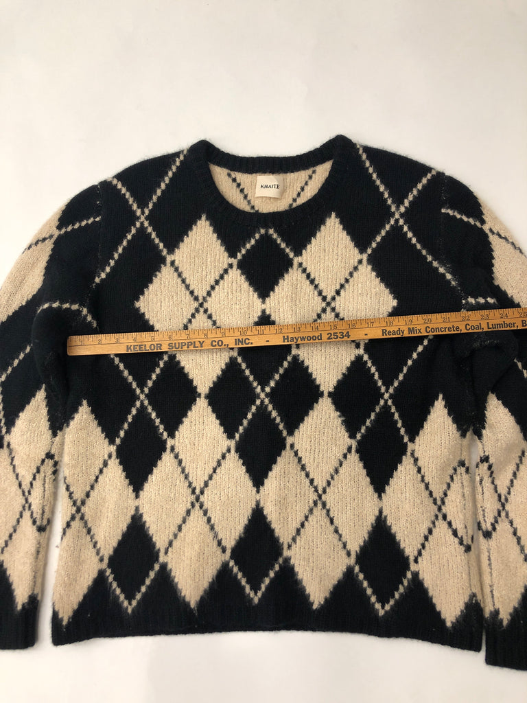 KHAITE Size L MULTI SWEATER ARGYLE BLACK BEIGE CASHMERE SILK BLEND LONG SLEEVES