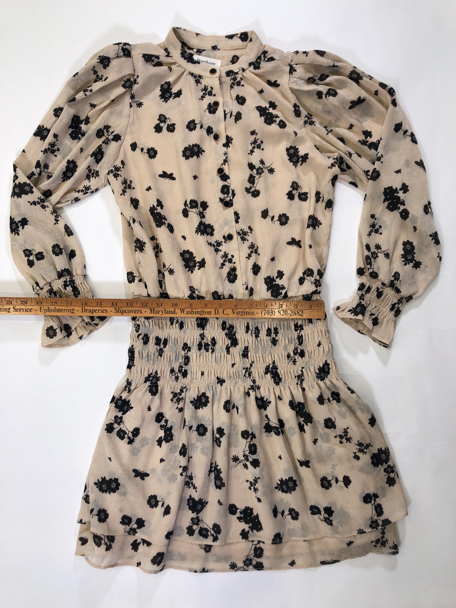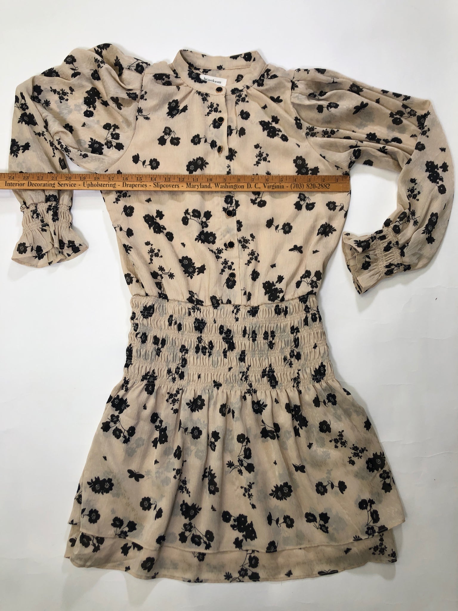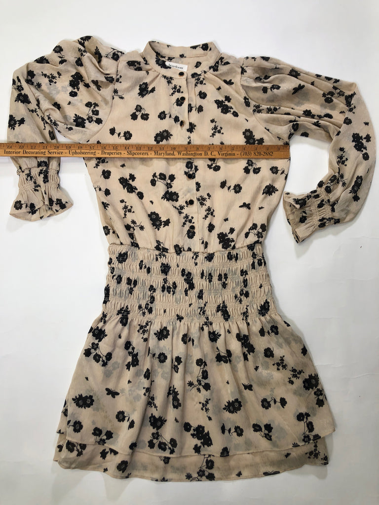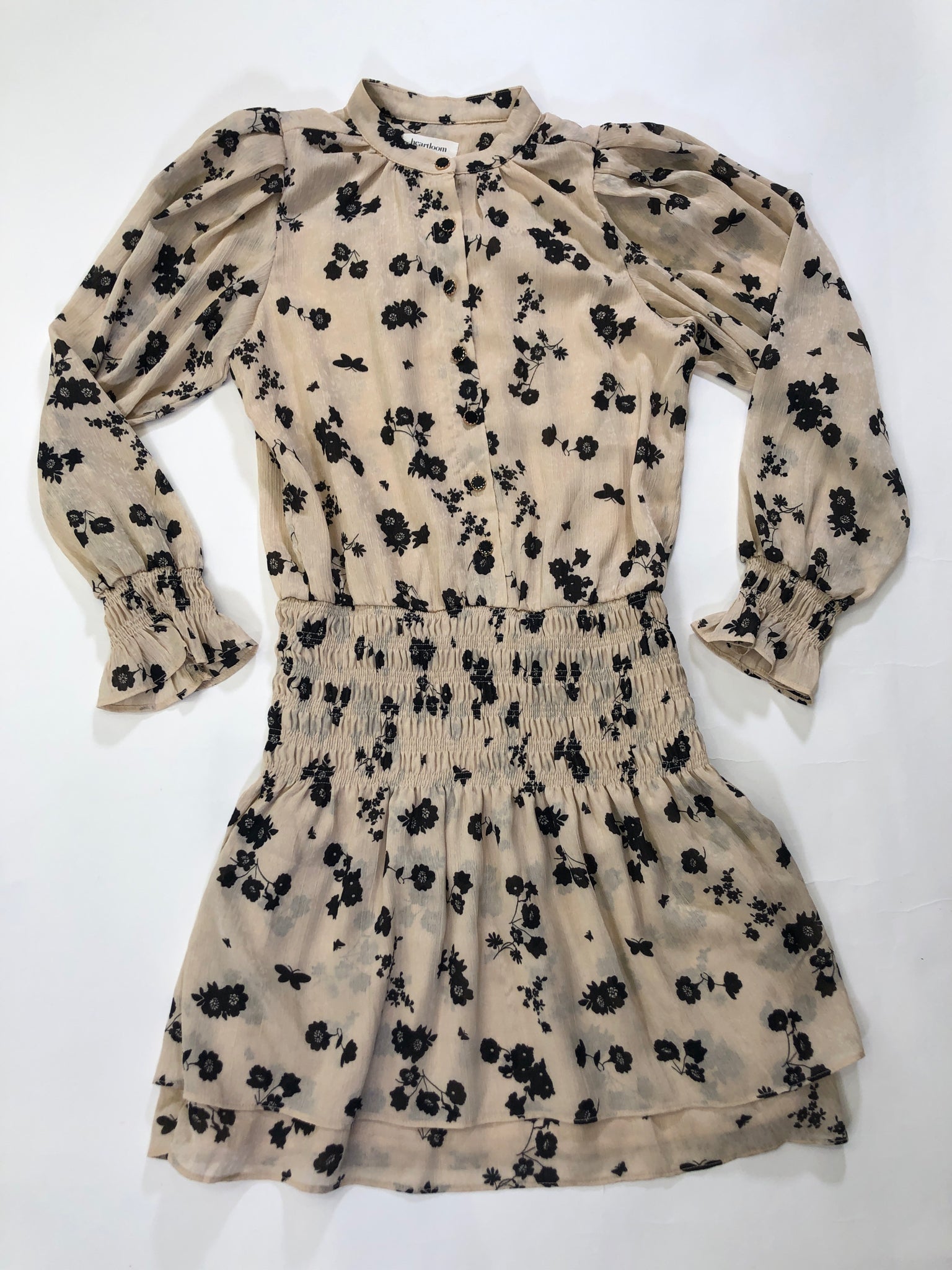 CREAM BLACK FLORAL LS SMOCKING POLY HEARTLOOM