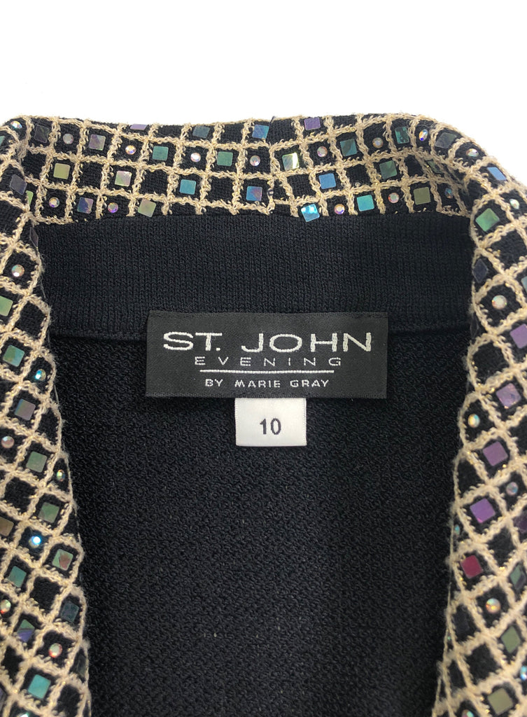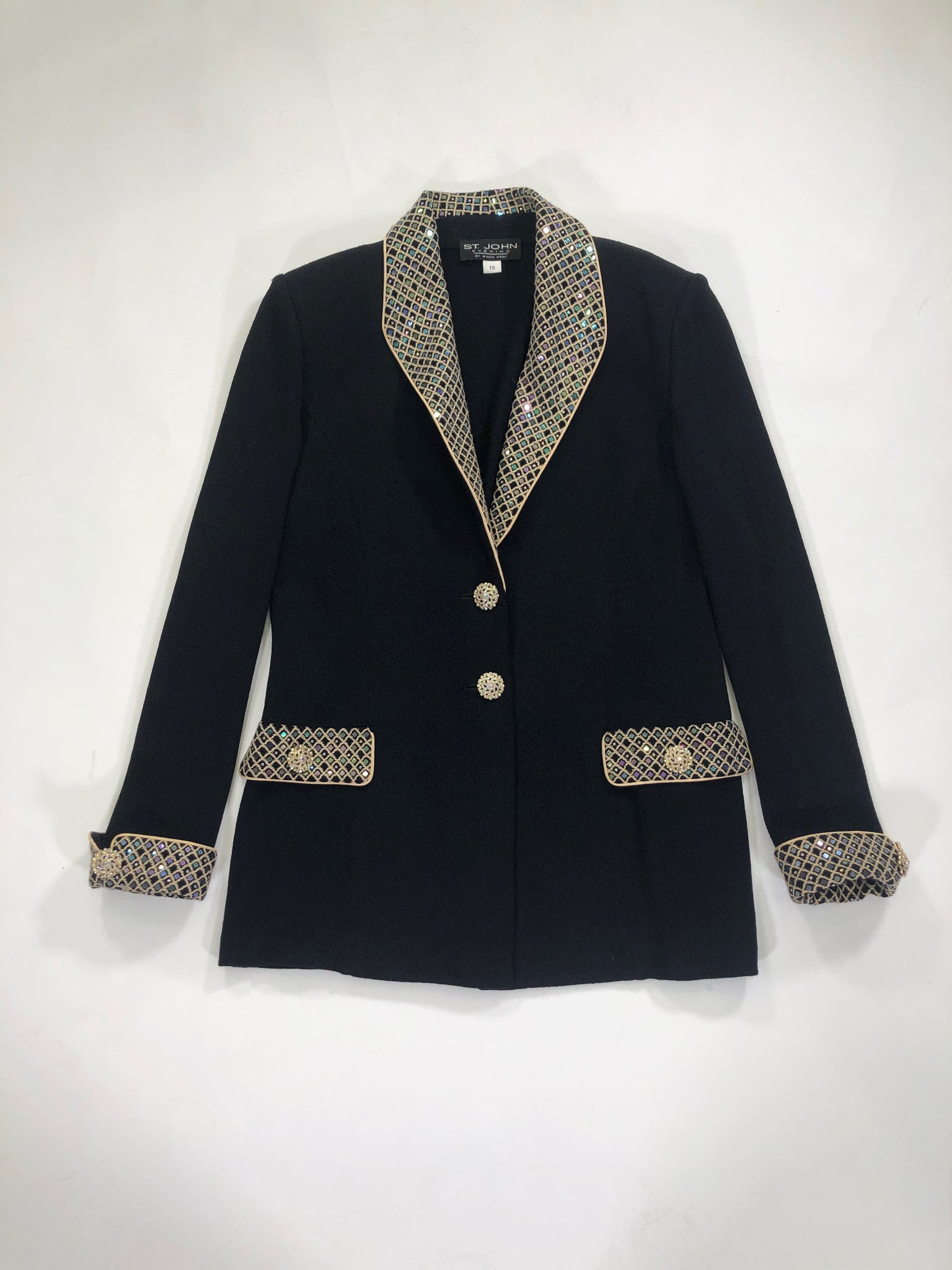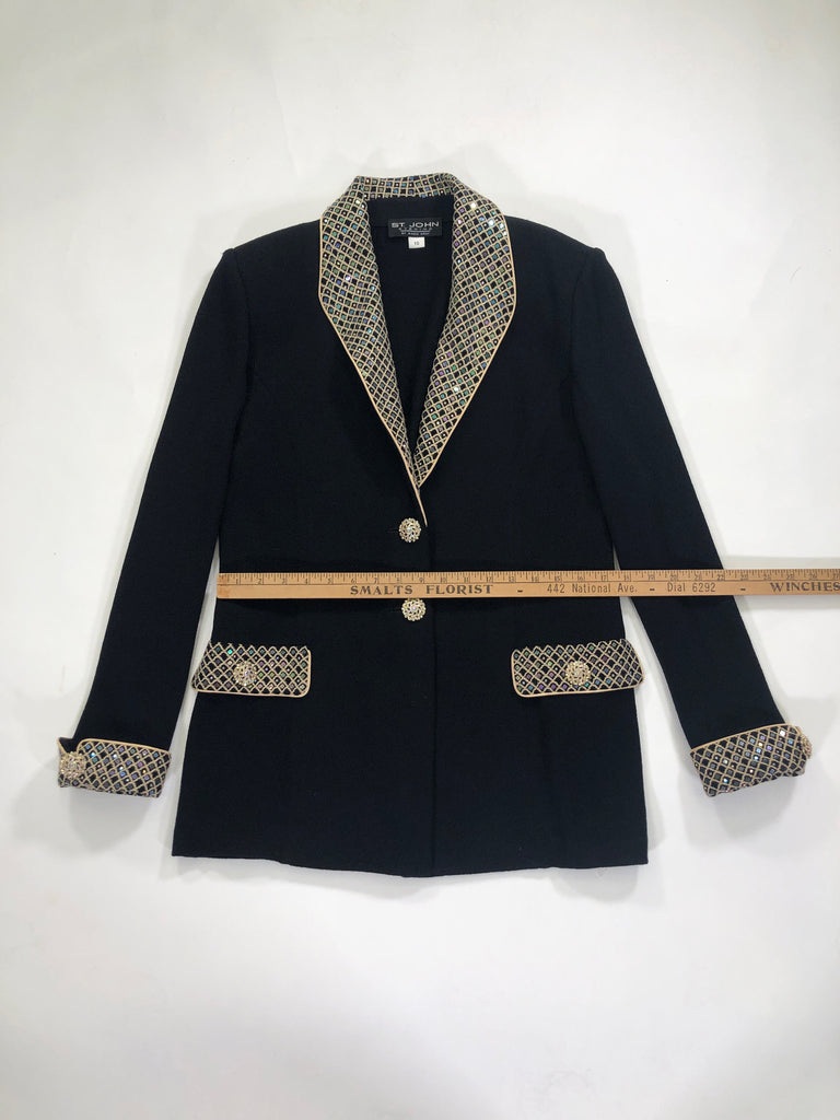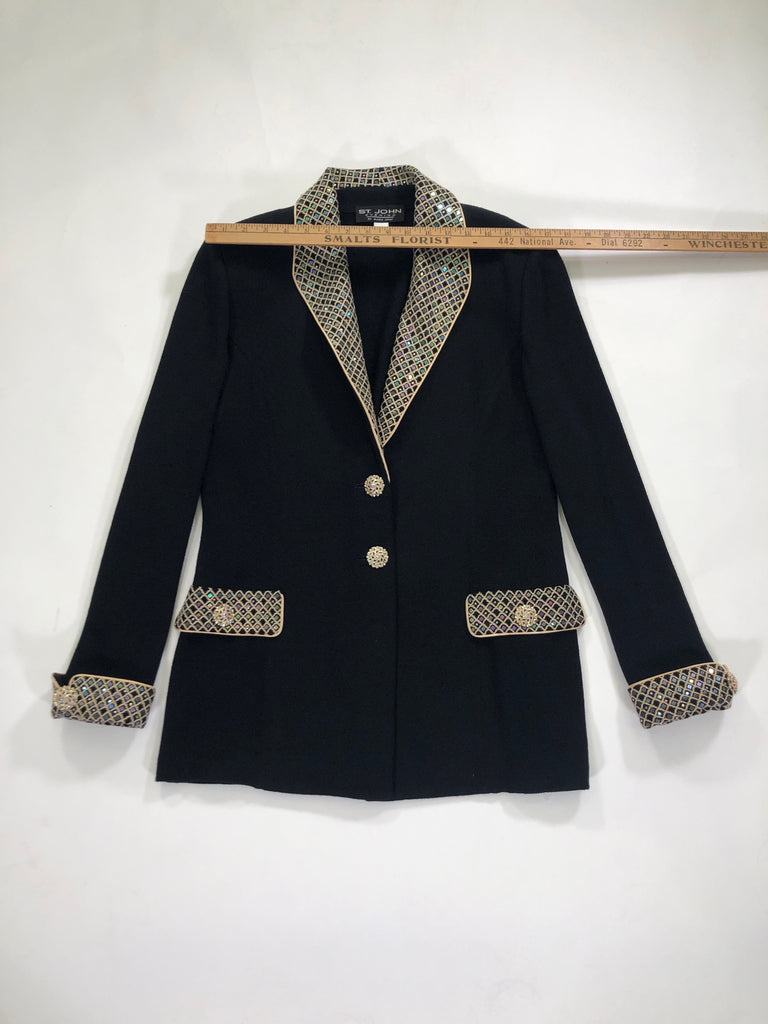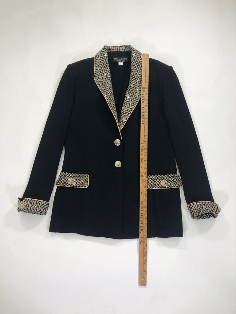 ST. JOHN Size 10 BLACK BLAZER LONG SLEEVES GOLD TRIM IRIDESCENT SEQUINS CRYSTALS