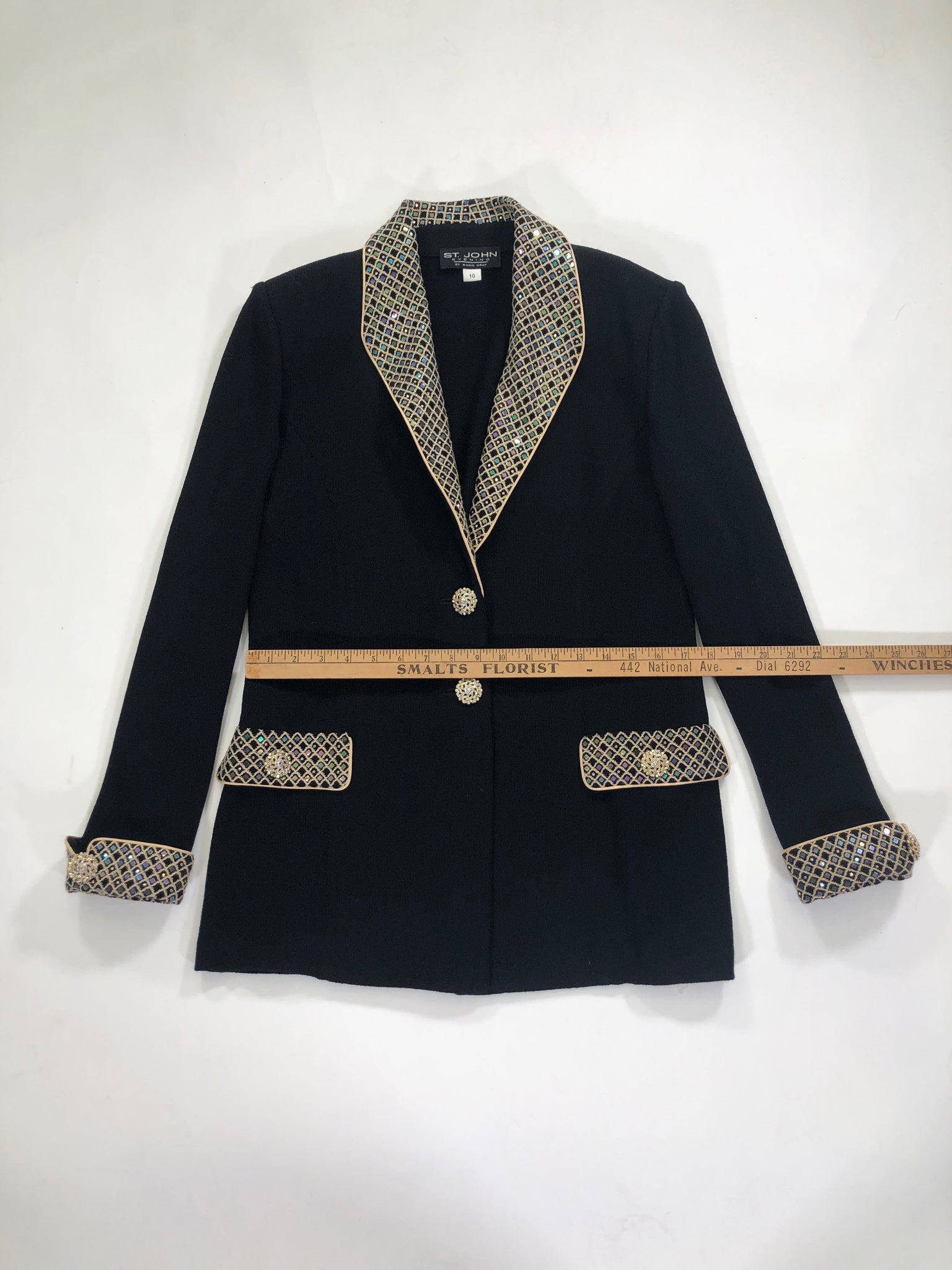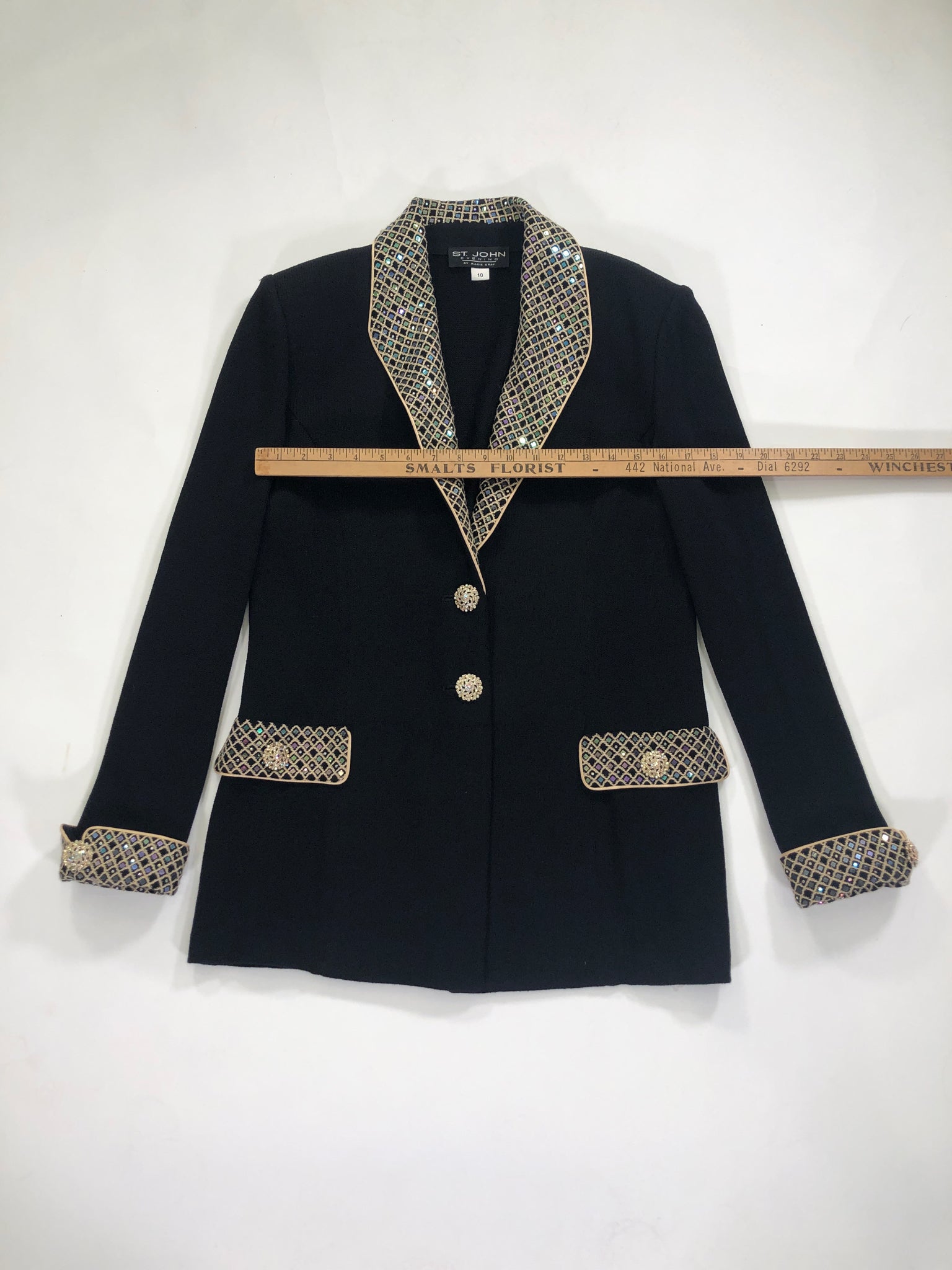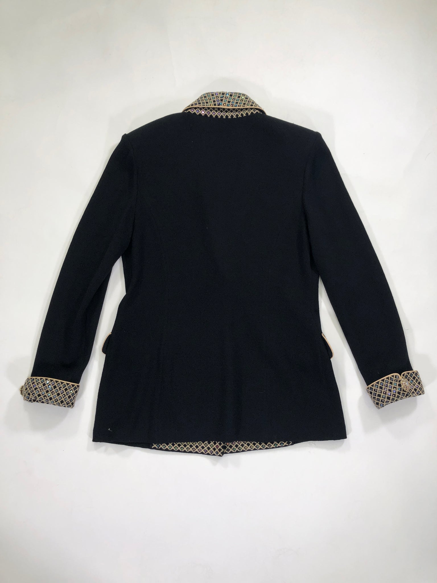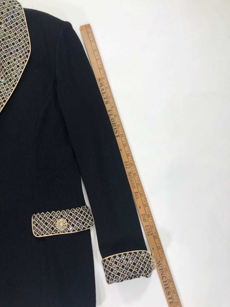 ST. JOHN Size 10 BLACK BLAZER LONG SLEEVES GOLD TRIM IRIDESCENT SEQUINS CRYSTALS