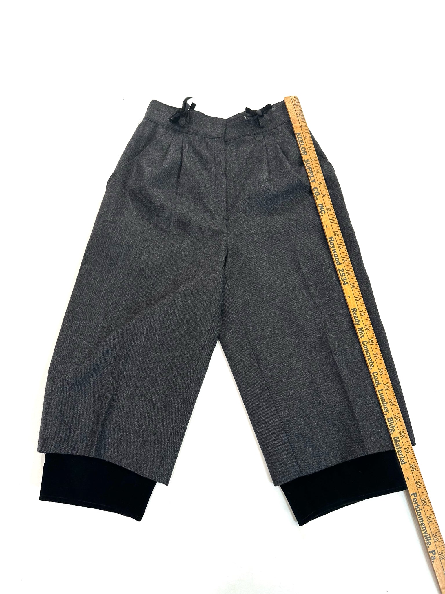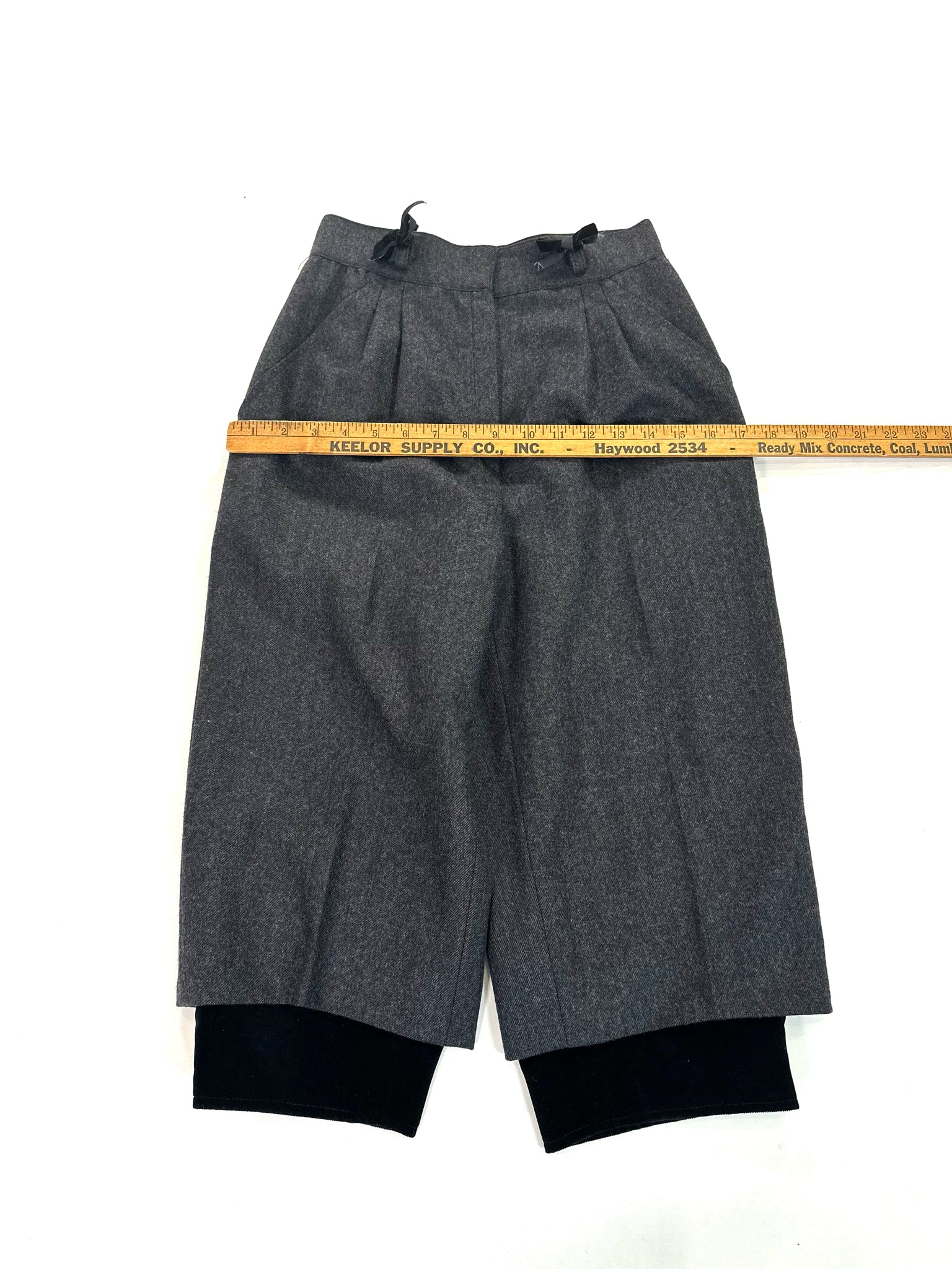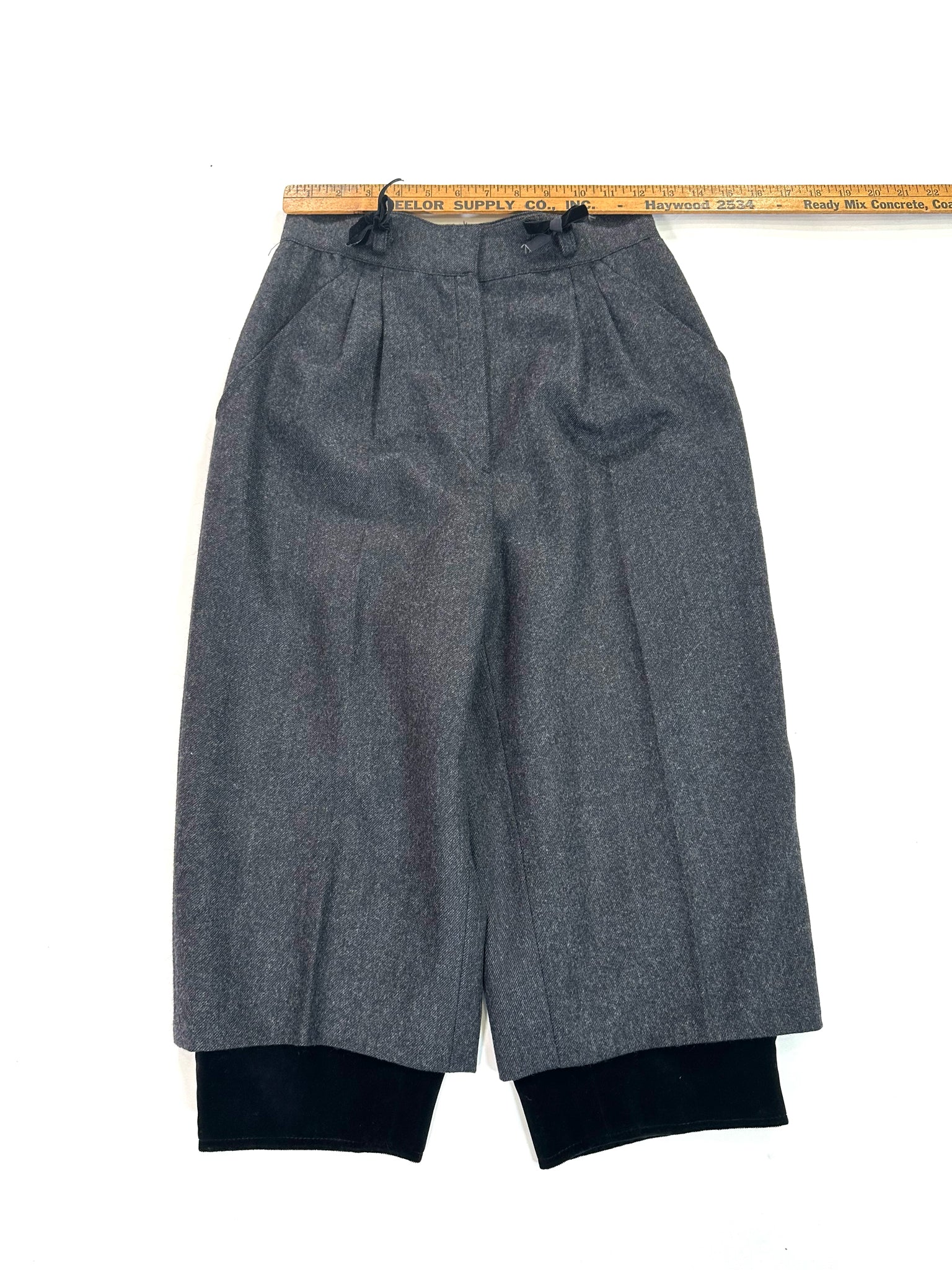 CHARCOAL WOOL W/ PLEATS BLACK VELVET HEM TRIM THREE BUTTONS AT HEM - THESE VINTAGE SHORTS ARE SO SHARP - WE ADDED THE LITTLE BLACK VELVET BOWS :)