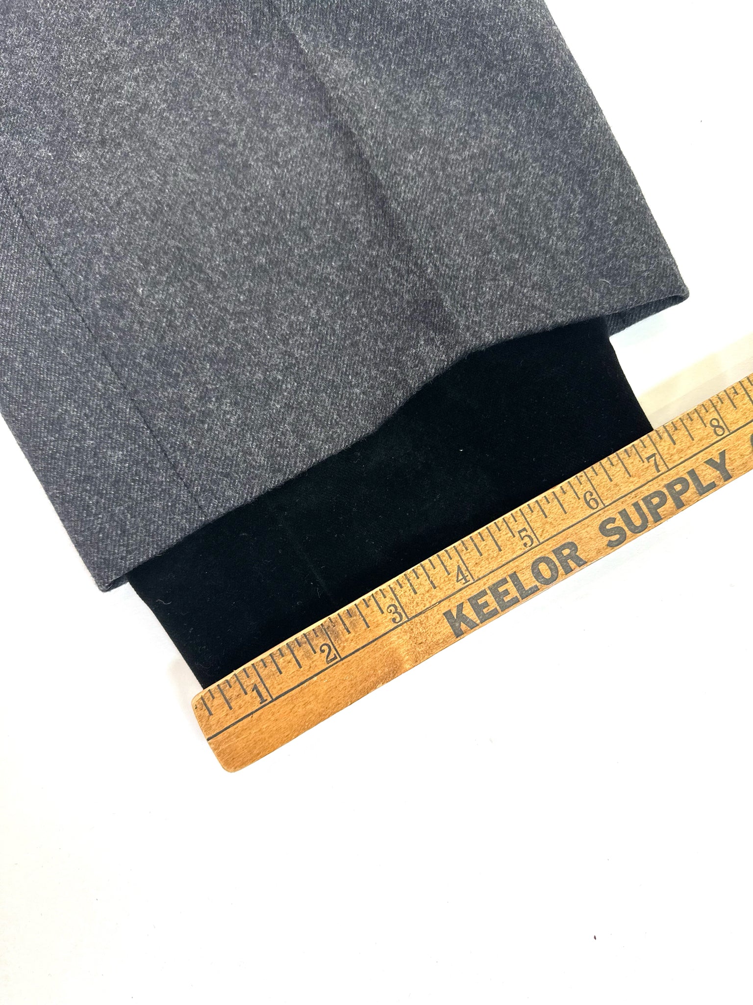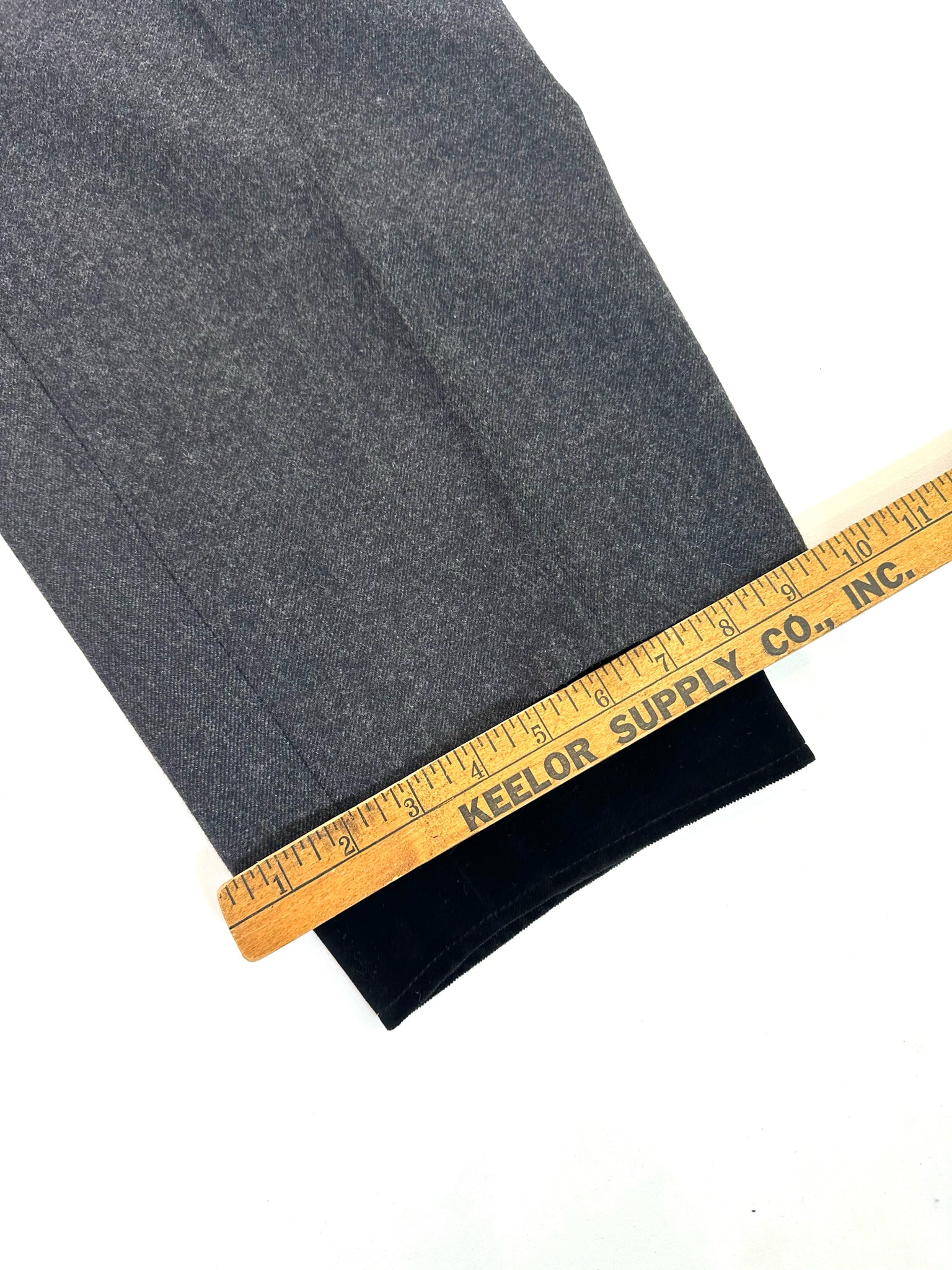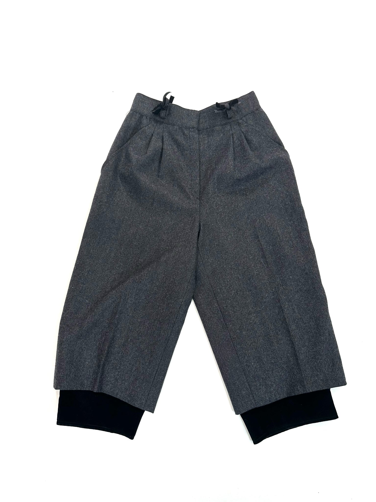 CHARCOAL WOOL W/ PLEATS BLACK VELVET HEM TRIM THREE BUTTONS AT HEM - THESE VINTAGE SHORTS ARE SO SHARP - WE ADDED THE LITTLE BLACK VELVET BOWS :)